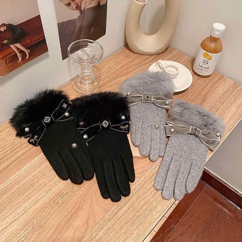 手袋 レディース 韓国風 リボン ラビットファー ウール カシミヤ混 指付き 保温 厚手 あったか 防風 タッチスクリーン対応 スマホ対応 サイクリング 防寒 冬 グレー 黒 グローブ