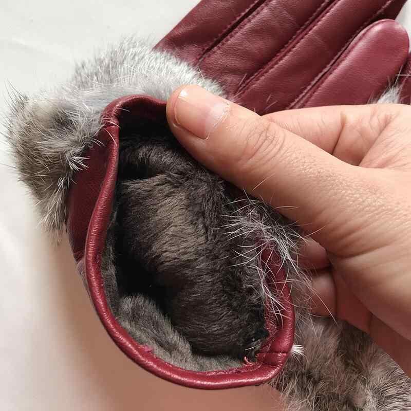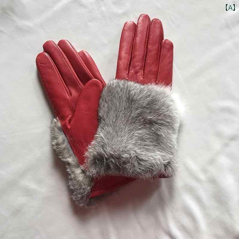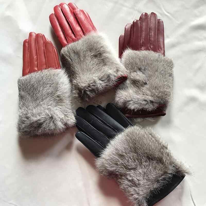 手袋 レディース 羊革 本革 ラビットファー 裏起毛 フルフィンガー グローブ 防寒 保温 秋冬 レッド 赤 おしゃれ ファッション 韓国風 通勤 通学 デイリーユース 高品質