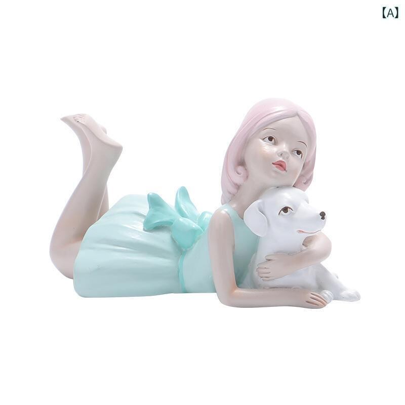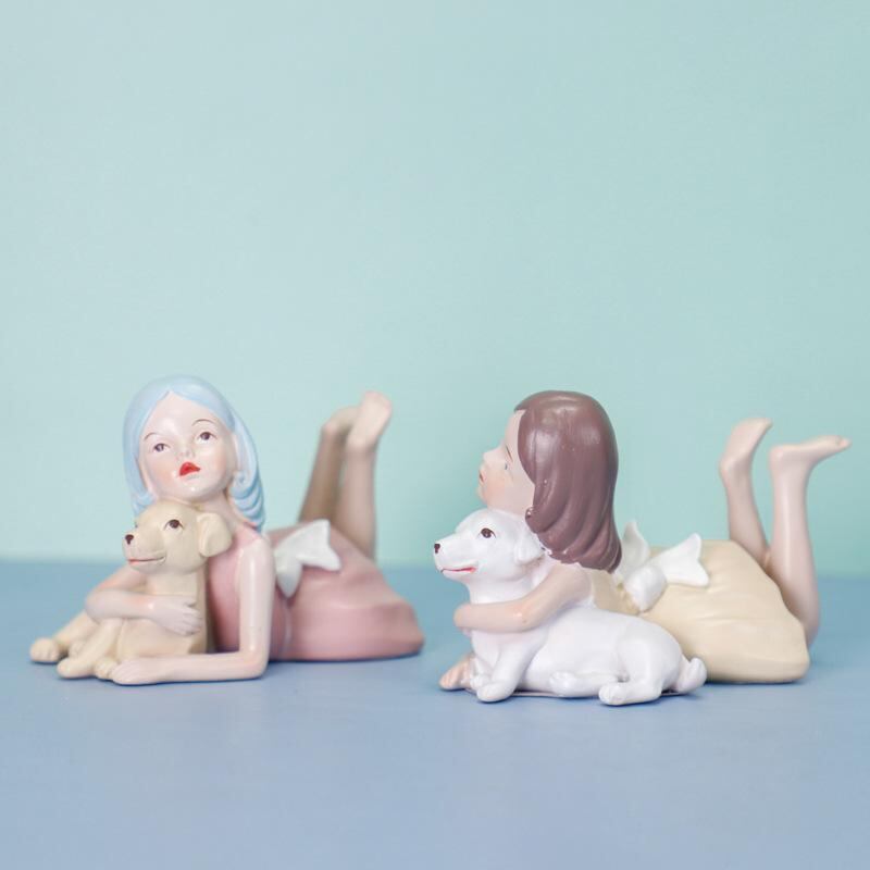 置物 北欧風 犬を抱いた少女の合成樹脂製オブジェ かわいいインスタ映えデザイン 女性の部屋飾り 女の子向け インテリア雑貨 フィギュア ブルー イエロー