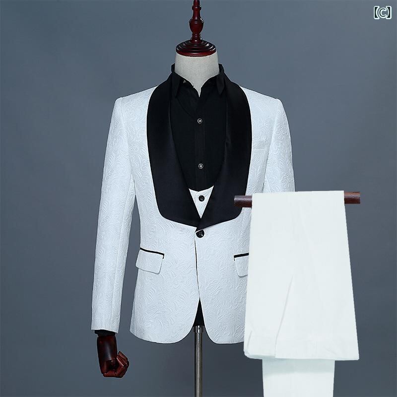 スーツ メンズ 男性用 スリーピース セットアップ ジャカード 織り柄 新郎 司会 舞台 演奏会 結婚式 二次会 パーティー イベント 撮影用 スリム 細身 化学繊維混紡 春秋