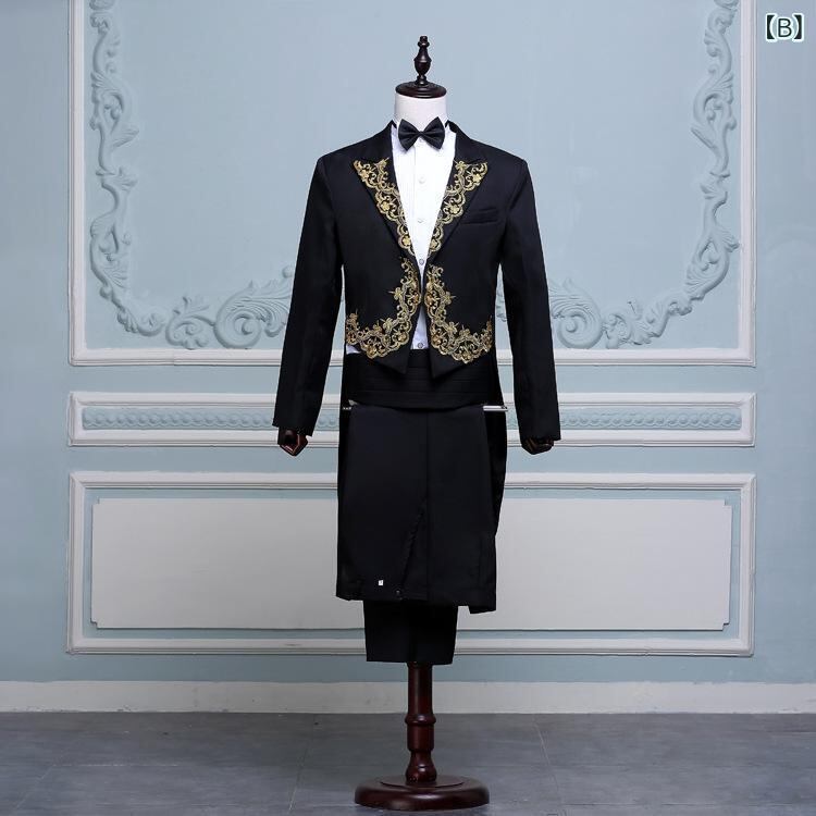 スーツ メンズ 男性用 フォーマル タキシード テールコート 金刺繍 セットアップ 舞台衣装 ステージ衣装 演奏会 指揮者 司会者 パフォーマー 発表会 黒 白 赤