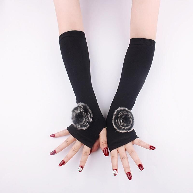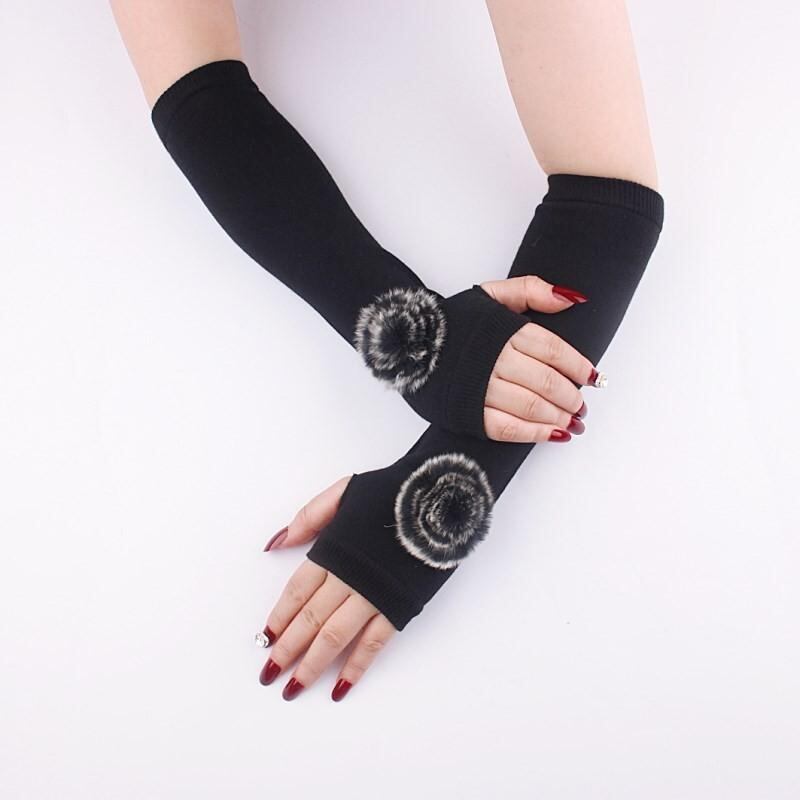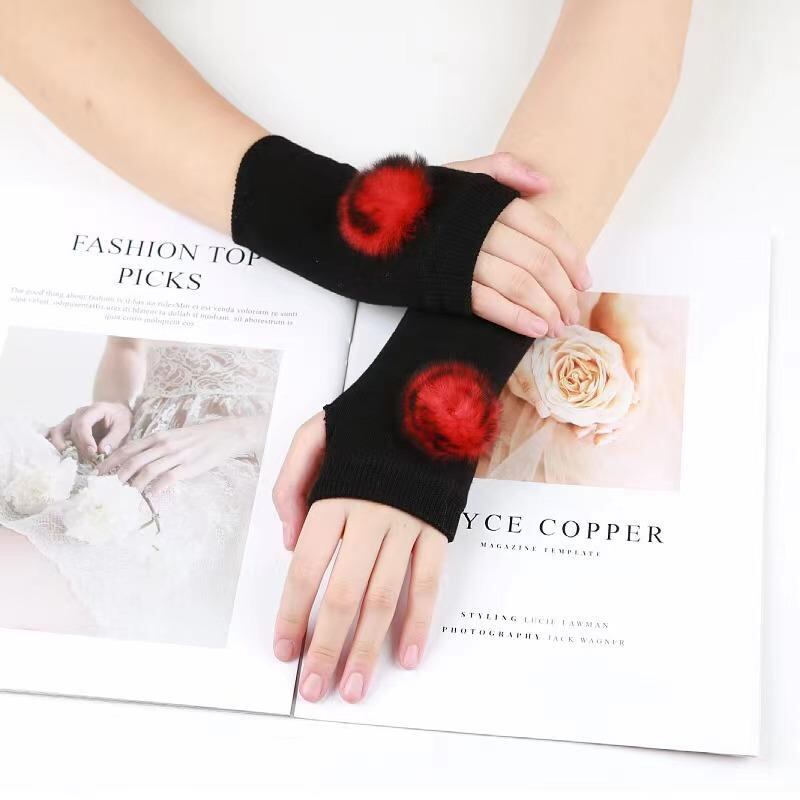 手袋 指なし ラビットファー ポンポン 指穴 アームウォーマー リストウォーマー フェイクスリーブ 防寒 あったか ミドル丈 ロング丈 コットン 秋冬 赤 黒 カジュアル