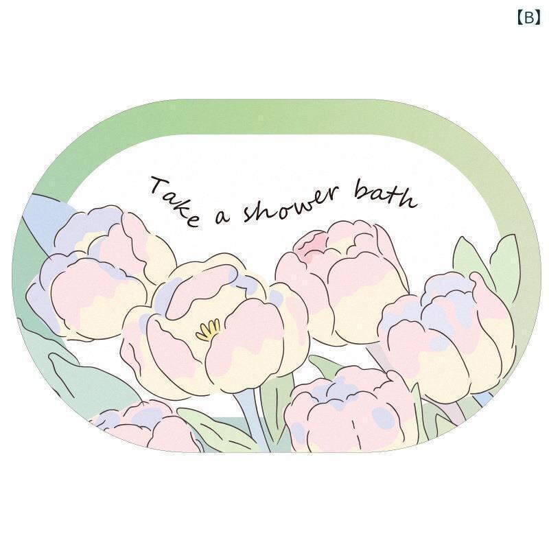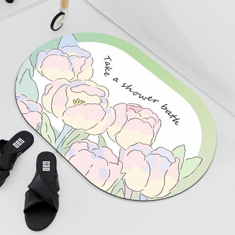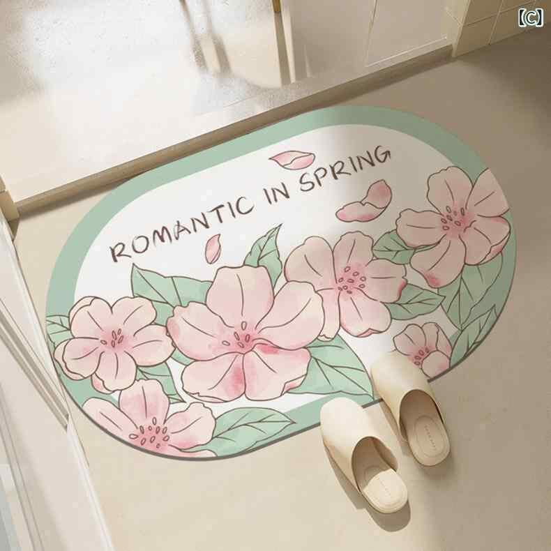 バスマット 吸水速乾 珪藻土 ソフト 高機能ファブリック チューリップ柄 家庭用 バスルーム 洗面所 脱衣所 足拭きマット 楕円形 滑り止め 抗菌防臭 ピンク グリーン 北欧風 おしゃれ 爽やか