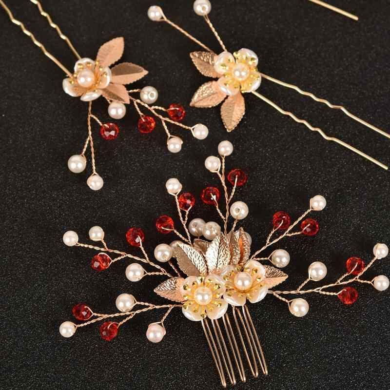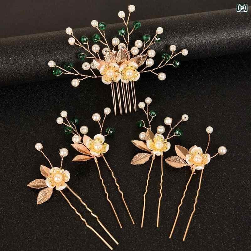 髪飾り レディース 5点セット ゴールドリーフ フラワー パール ヘアピン ブライダル ウェディング 結婚式 二次会 パーティー レトロ アンティーク風 ヘッドドレス