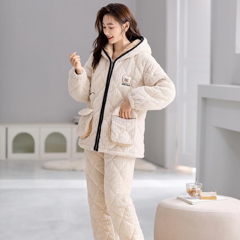 パジャマ レディース 冬 フランネル サンゴフリース 中綿入り 裏起毛 厚手 保温 もこもこ 上下セット ルームウェア 部屋着 寝間着 外出 ワンマイルウェア 長袖 長ズボン カジュアル 快適