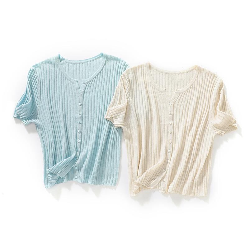ニット レディース 半袖 Vネックカーディガン トップス テンセル 麻 混紡 薄手 接触冷感 爽やか 通気性 スリム 細見え 着痩せ リブ編み アイロン不要 通勤 オフィス 上品 エレガント 青 ベージュ 黒 春夏