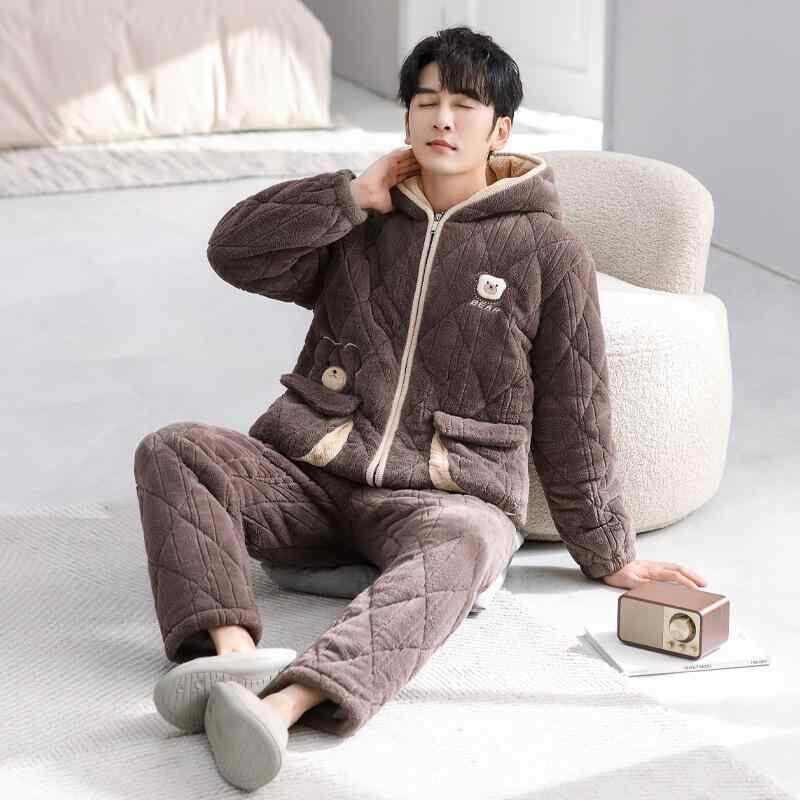 ルームウェア メンズ 男性用 秋冬 部屋着 パジャマ 寝巻き 3層構造 中綿入り サンゴフリース フランネル 裏起毛 極厚 保温 防寒 暖かい フード付き 上下セット 長ズボン 長袖 ゆったり 快適