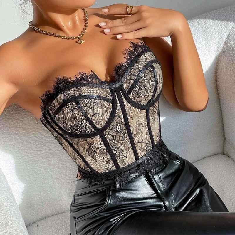ベアトップ レディース ストリート セクシー 欧米カジュアル ワイヤー入り 魚骨ボーン ウエストシェイプ レース スリムフィット ショート丈 ポリエステル ポリウレタン 伸縮性 ブラック
