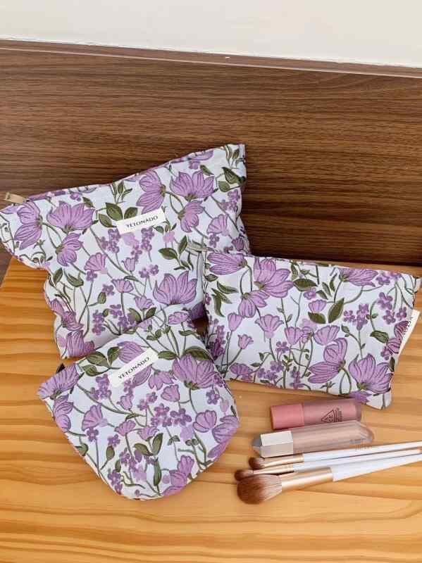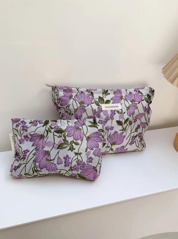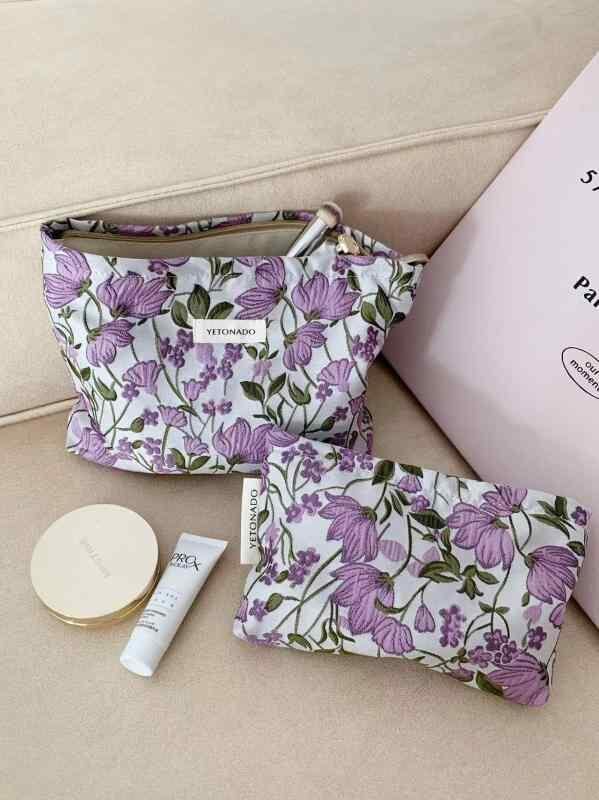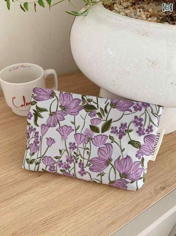 ポーチ レディース 女性用 かわいい タロイモフラワー柄 パープル系 大容量 コスメ 化粧品入れ トラベル 旅行用 収納 携帯 お出かけ デイリー インナーバッグ 帆布 キャンバス 仕切り付き