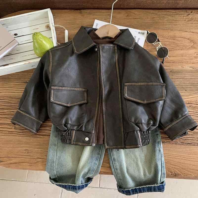 ジャケット 男の子 ボーイズ PUレザー フェイクレザー ストリート カジュアル かっこいい クール 春秋 フラップカラー ショート丈 ブラウン アウター ブルゾン