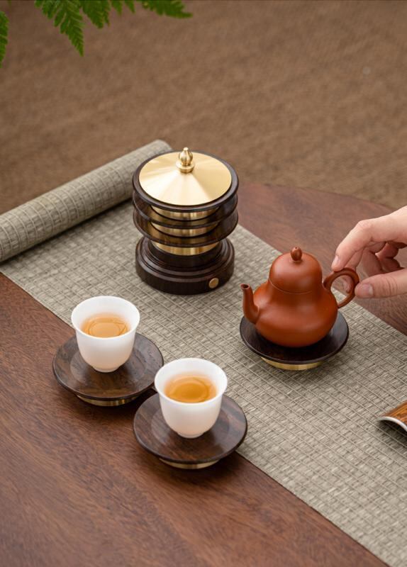 コースター 塔型 銅製 木製 無垢材 新中式スタイル 断熱 高級感 茶道 茶托 セット お茶 来客用 普段使い 黒檀 花梨木