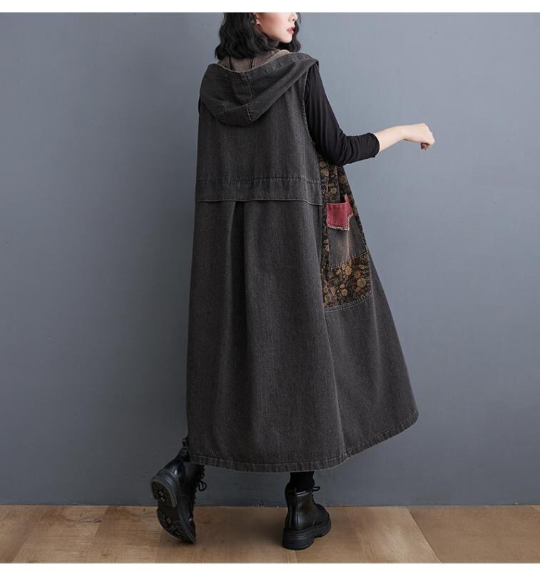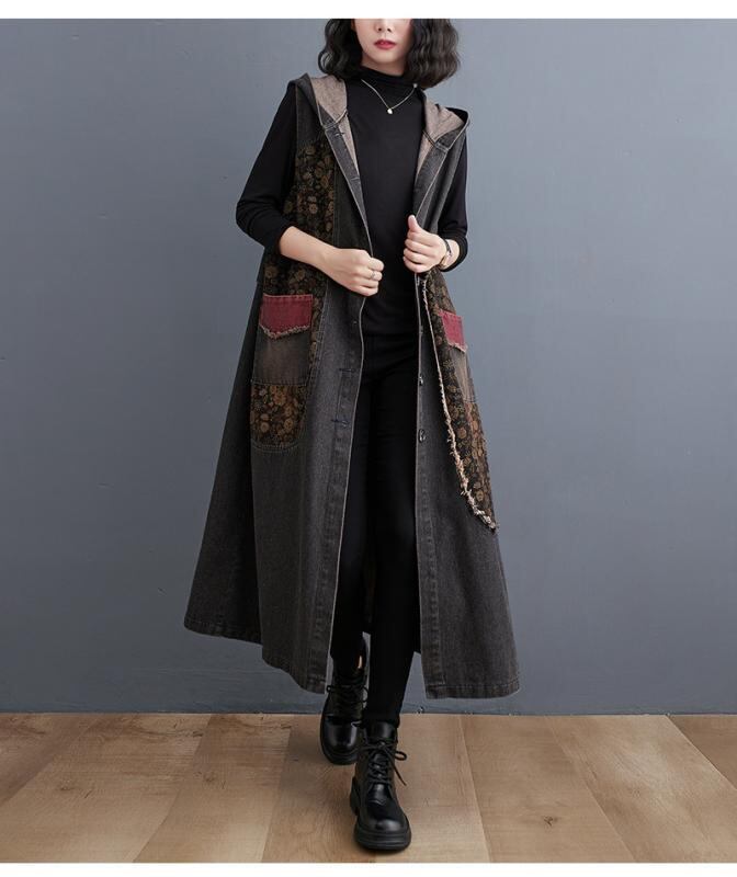 ・カテゴリ: ベスト・アイテムデザイン: カーディガン風・スタイル: レトロ・着丈: ミドル丈・ネックライン: フード付き・柄: 植物花柄・デザイン要素: 配色デザイン・素材: デニム・主な素材: 綿 50%〜70%・詰め物: 綿・前開き: シングルボタン・シルエット: ルーズフィット・対象年齢層: 大人・対象性別: 女性・カラー展開: ブルー、ブラック・サイズ展開: M、L、XL、XXL