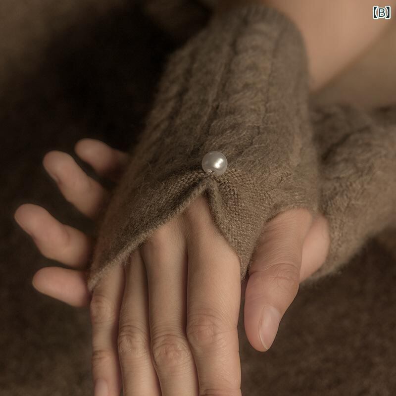手袋 レディース 100% カシミヤ 指なし ケーブル編み アラン編み パール装飾 グローブ 秋冬 防寒 保温 暖かい アームウォーマー デイリーユース ファッション 高見え 上品