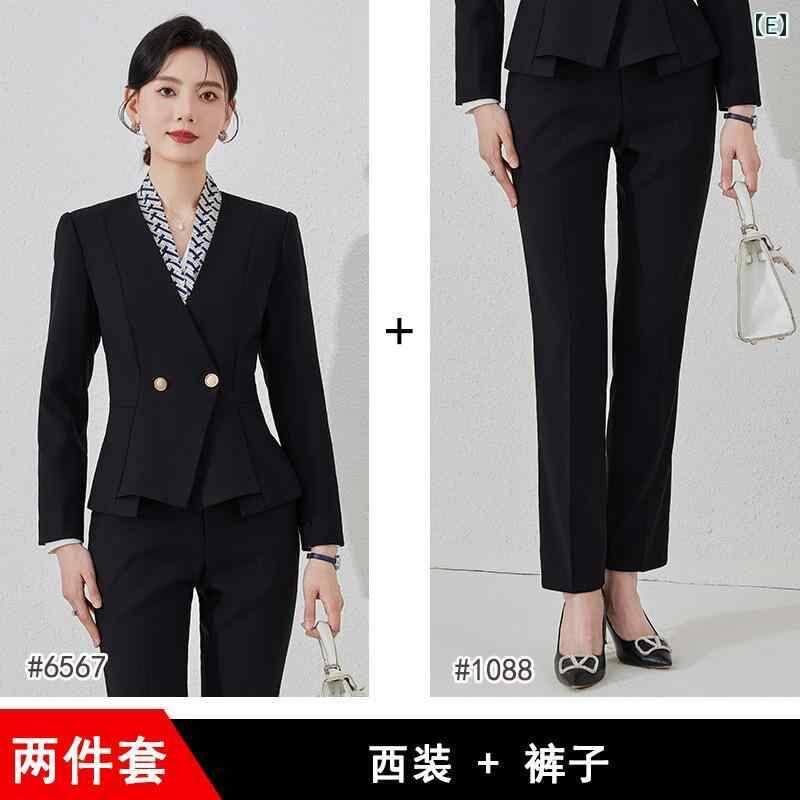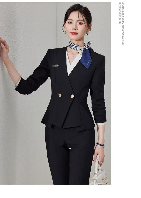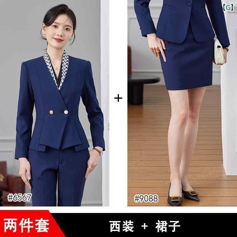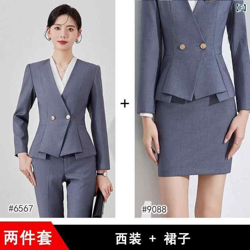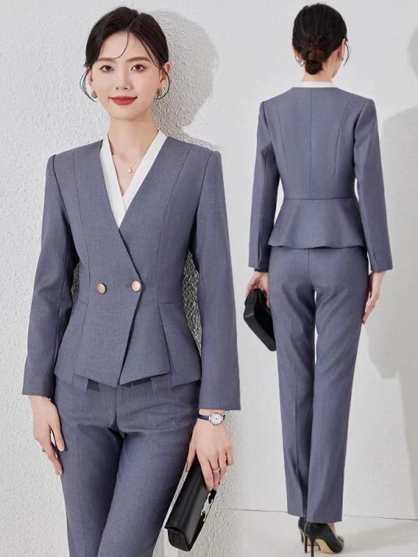 スーツ レディース 女性用 宝飾店 ジュエリーショップ 受付 フロント 接客 オフィス 制服 ユニフォーム ビジネススーツ セットアップ 長袖 Vネック グレー ポリエステル 伸縮性 秋冬