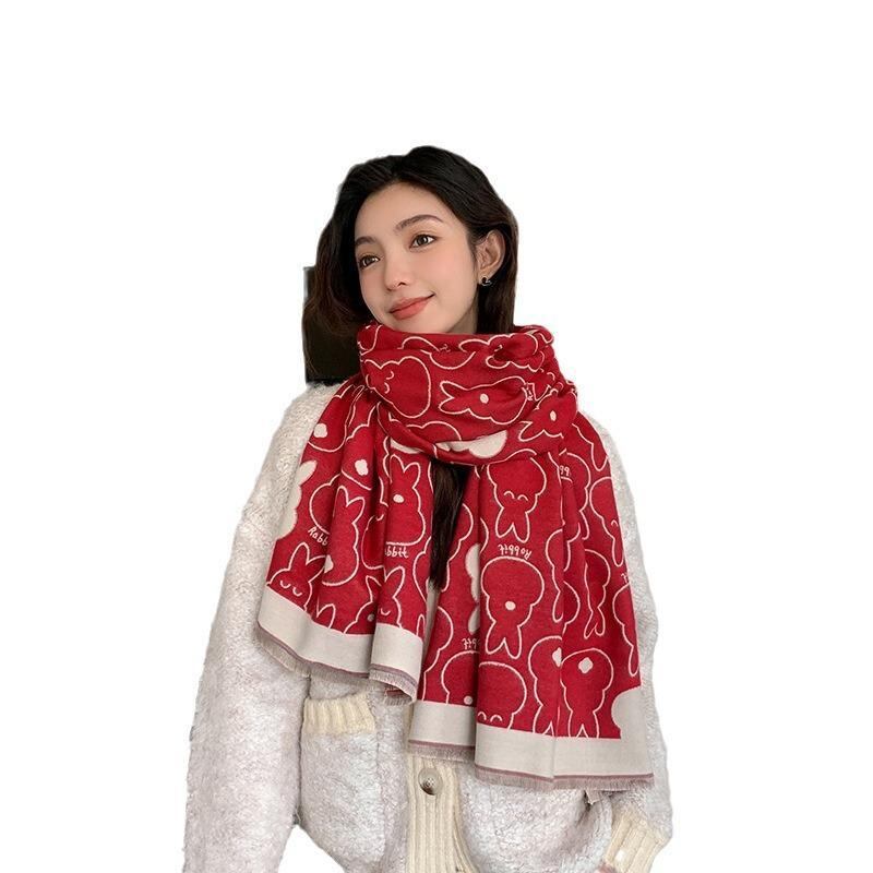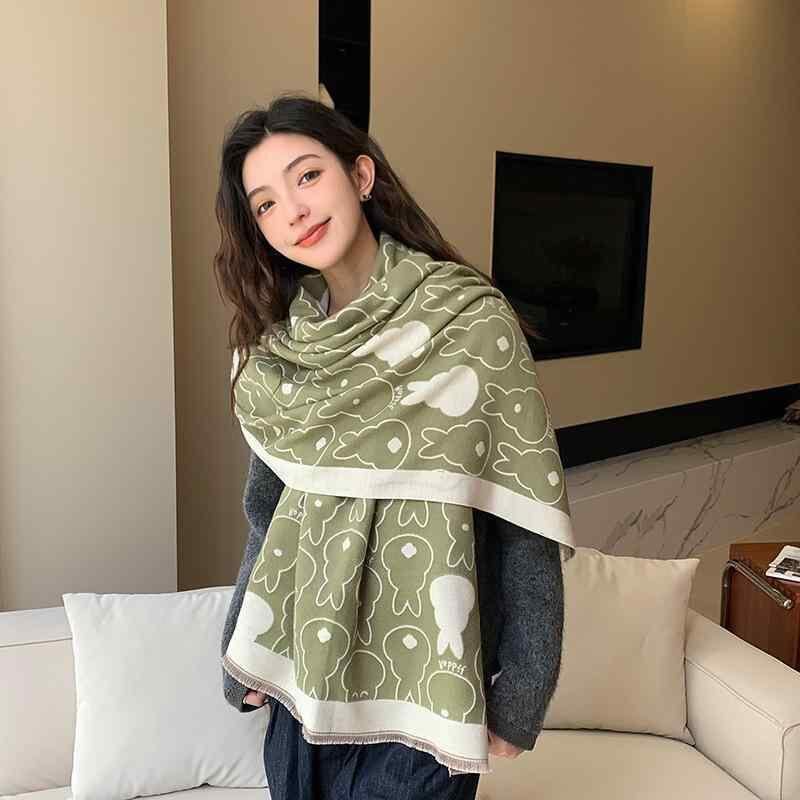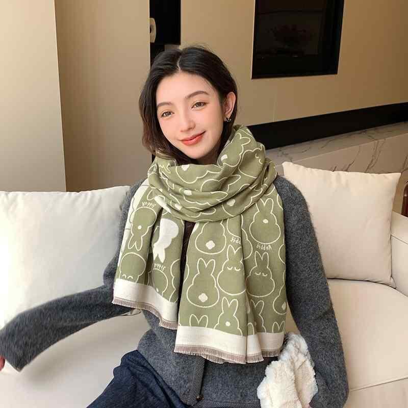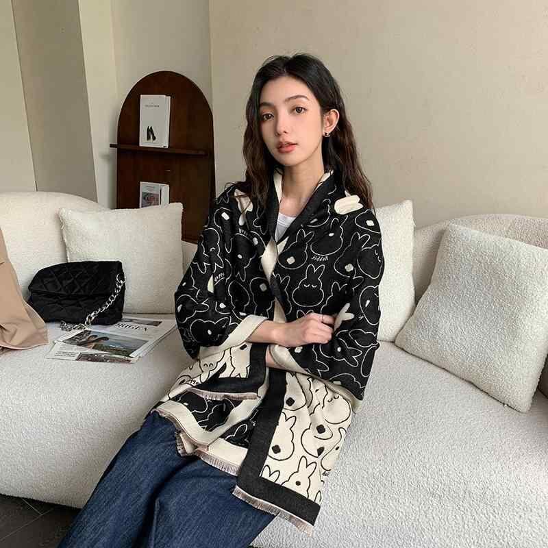 マフラー レディース うさぎ柄 かわいい 秋冬 韓国スタイル フェイクカシミヤ ポリエステル レーヨン 大判 リバーシブル ロング ストール ショール 2WAY 防寒 暖か カジュアル 学生
