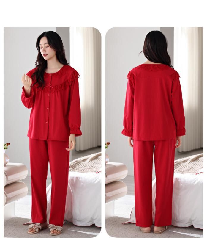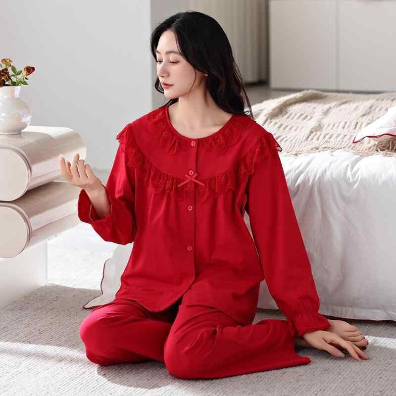 パジャマ レディース 女性用 春秋 長袖 開襟 前開き 綿100% コットン ゆったり 大きいサイズ ビッグサイズ リラックス 快適 上下セット ルームウェア 部屋着 結婚 新婚 赤 レッド