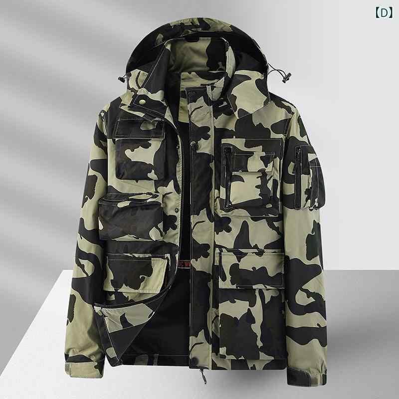 ジャケット メンズ 春秋 マウンテンパーカー フード付き 多ポケット ミドル丈 ワークカジュアル アウター ナイロン 耐摩耗性 カーキ ブラック 迷彩