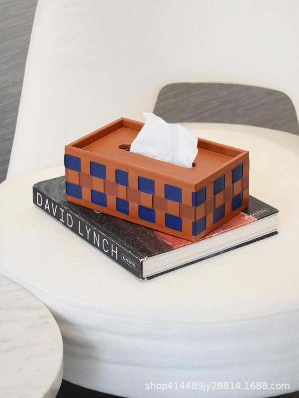 ティッシュケース ゴールドブラウン アイリスブルー チェッカーボード柄 レザー製 スクエア型 高級感 ライトラグジュアリー 卓上 リビング デスク オフィス インテリア雑貨