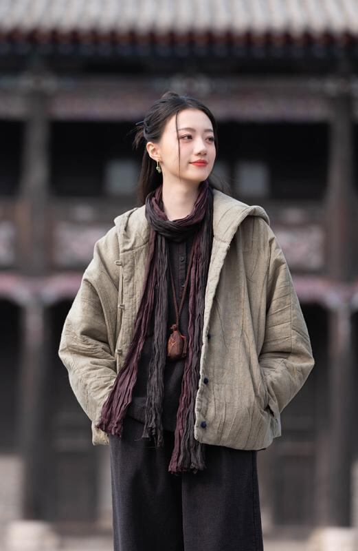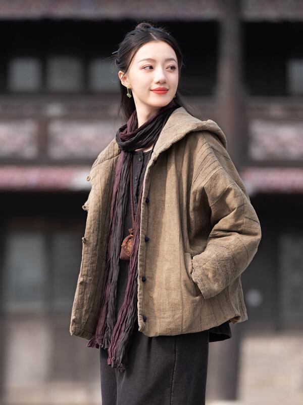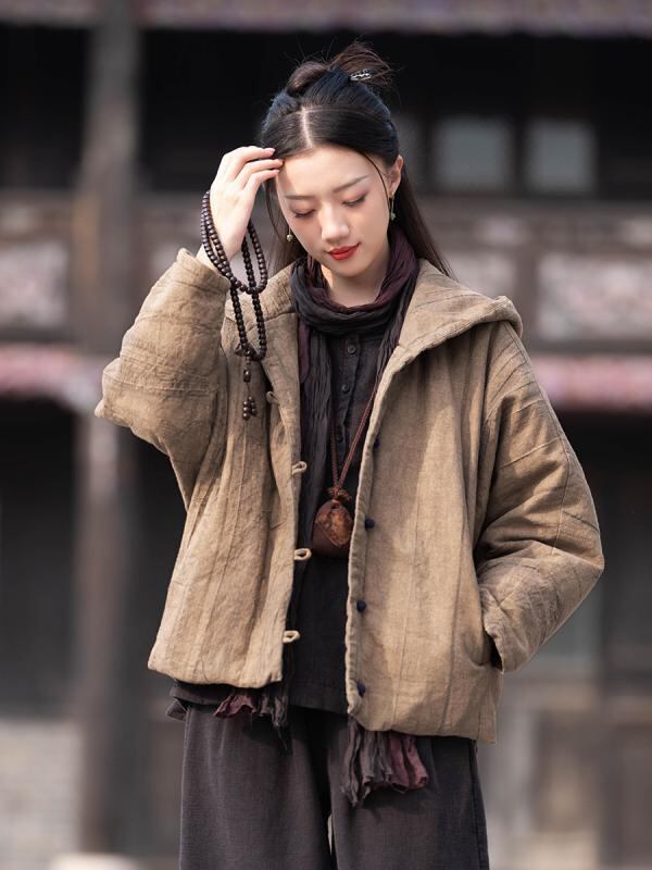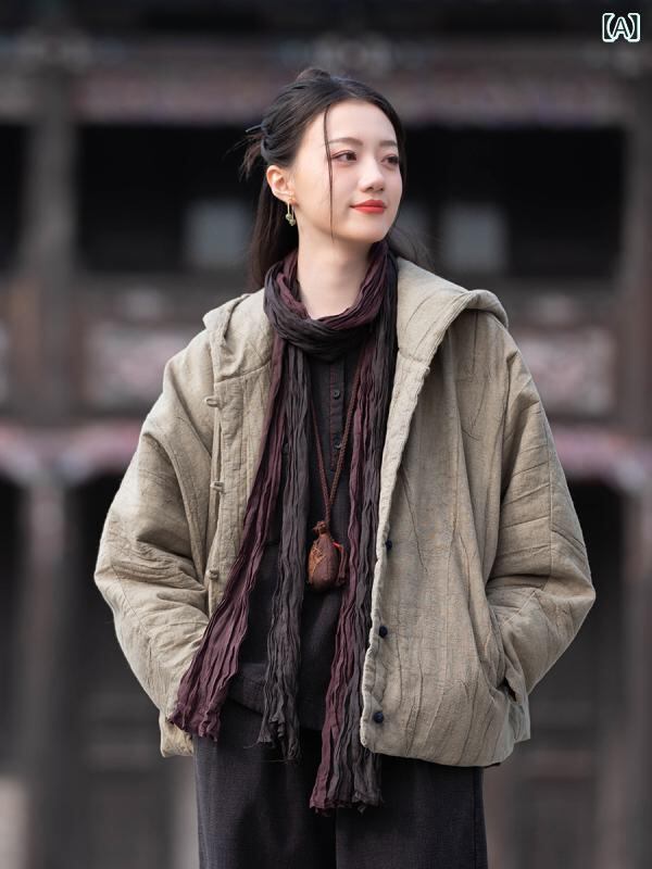 中綿ジャケット レディース 秋冬 フード付き ショート丈 ラミー 苧麻 綿麻 コットンリネン ハンドメイド 絞り染め ヴィンテージ加工 ユーズド加工 ゆったり オーバーサイズ カジュアルスタイル レトロモダン 厚手
