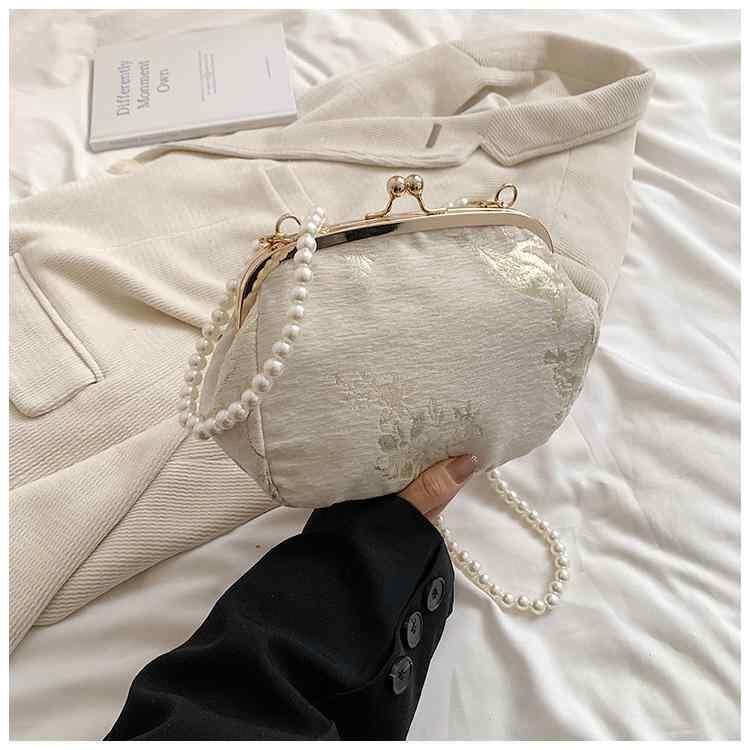 バッグ レディース 女性用 レトロ 中国風 チャイナドレス 漢服 刺繍 パール 斜めがけ がま口 ショルダーバッグ ハンドバッグ ベルベット シェル型 餃子型 ブラック ホワイト クラシック エレガント お出かけ デイリーユース