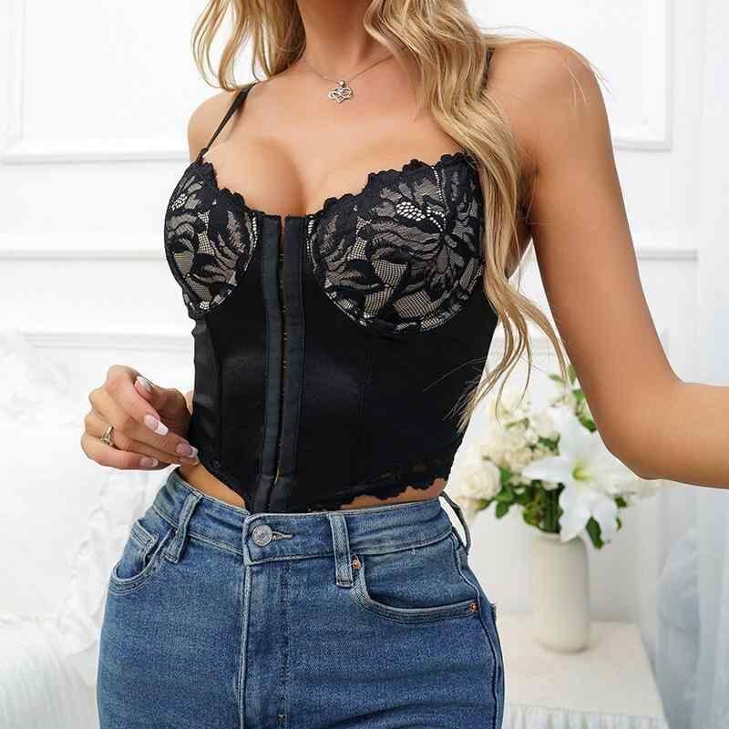 キャミソール レディース 秋冬 タイトビスチェ コルセット風 ウエストシェイプ スタイルアップ レース インナー トップス セクシー ショート丈 フロントホック ポリエステル ブラック