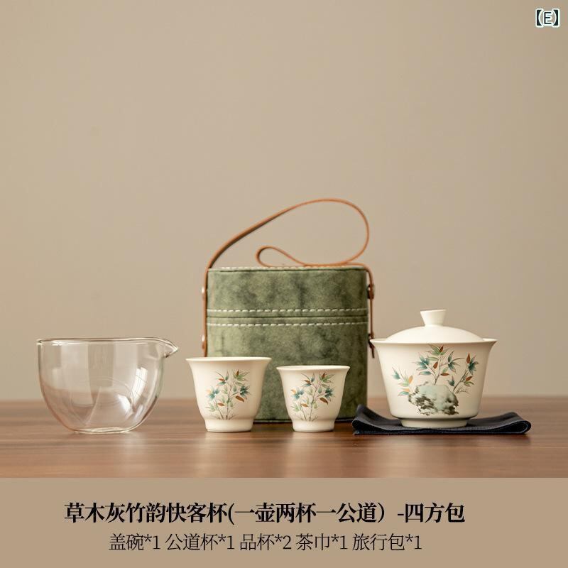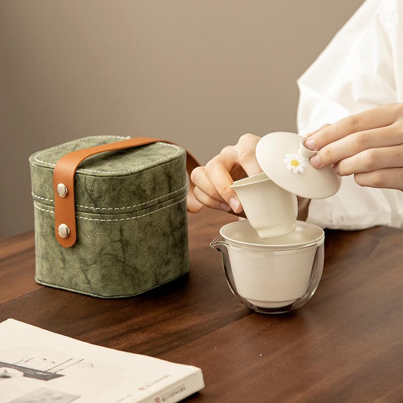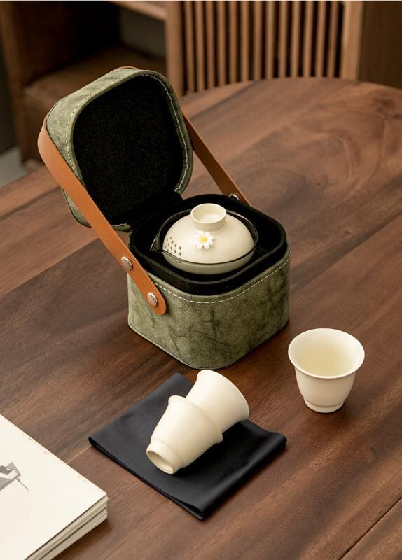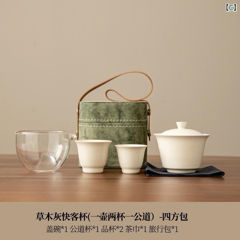 茶器セット 旅行 携帯 ポータブル お茶道具 急須 カップ レザー 収納ケース スクエア型 厚手 手作り モダン シンプル コンパクト アウトドア オフィス 来客用 グリーン ブラウン グレー