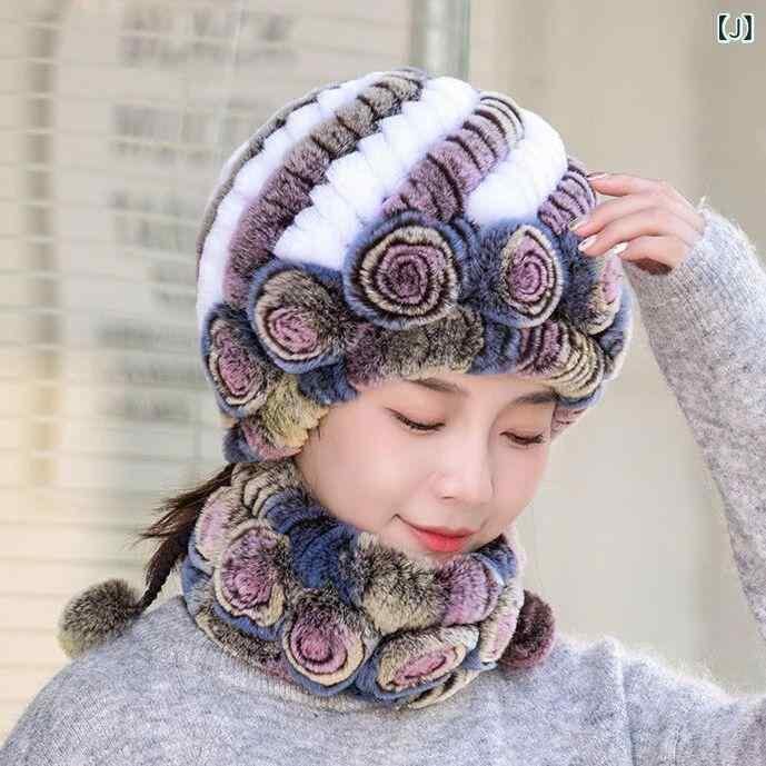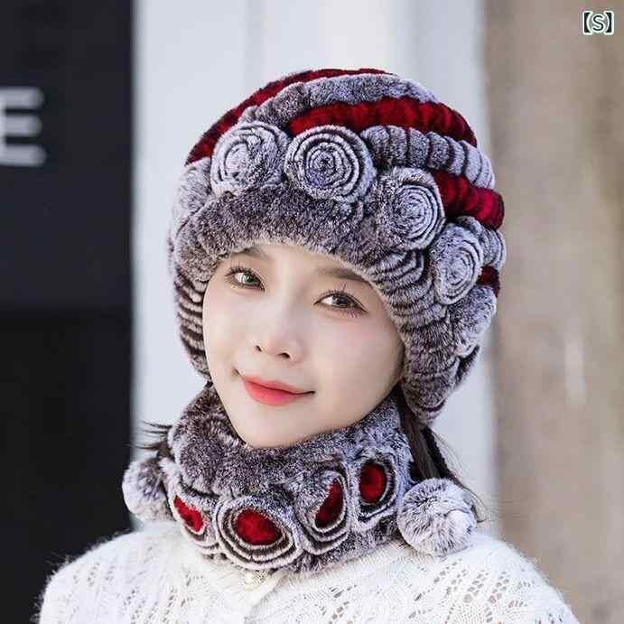 帽子 レディース 秋冬 レッキスラビットファー ネックウォーマー 2点セット 耳当て付き 保温 防寒 あったか 手編み ミセス 婦人 普段使い お出かけ