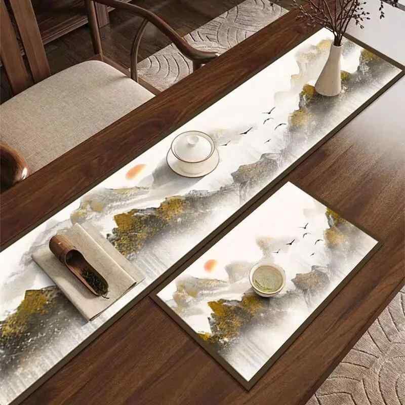 茶器マット 中華風 古風 禅テイスト 吸水速乾 防塵 防汚 耐熱断熱 TPE素材 洗濯可能 和モダン 風景柄 抽象画 テーブルランナー 家庭用 食卓 リビング