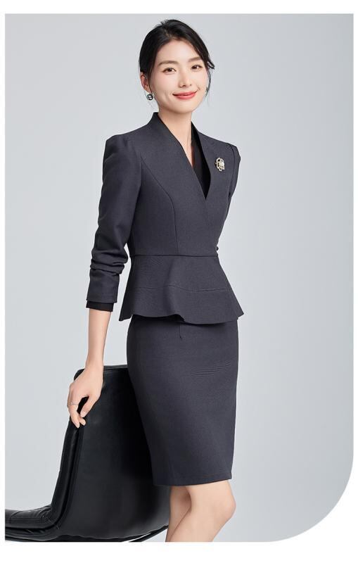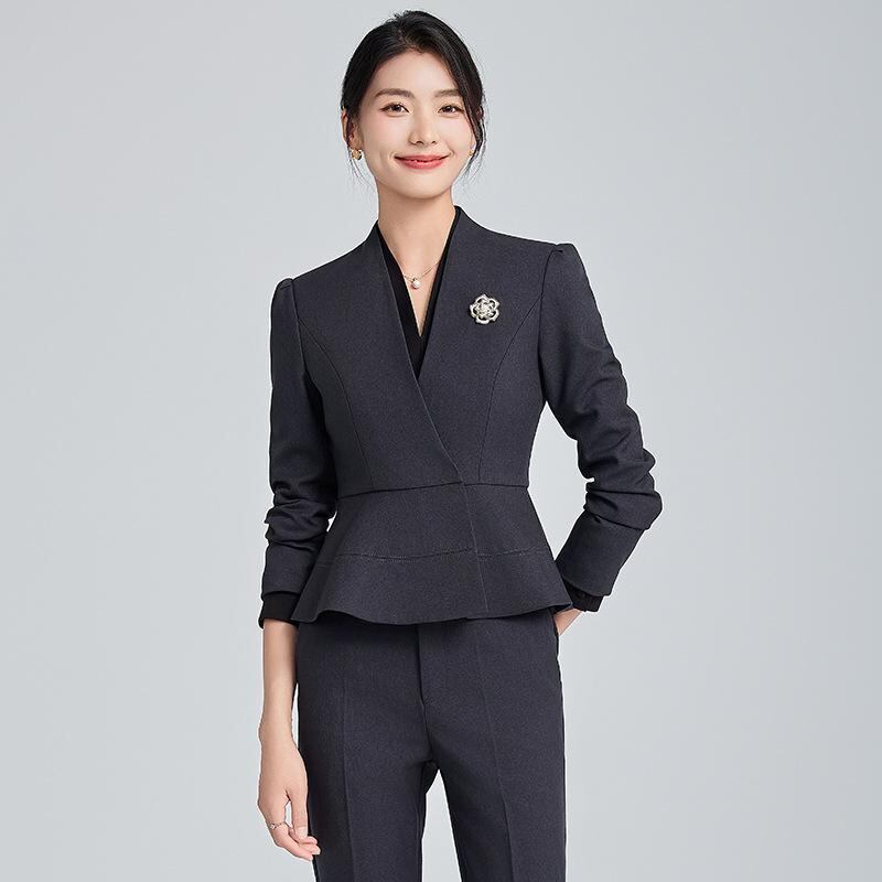 スーツ セットアップ ジャケット ロングパンツ 長袖 ビジネス オフィス 通勤 制服 ユニフォーム グレー 春秋 ポリエステル スパンデックス エレガント