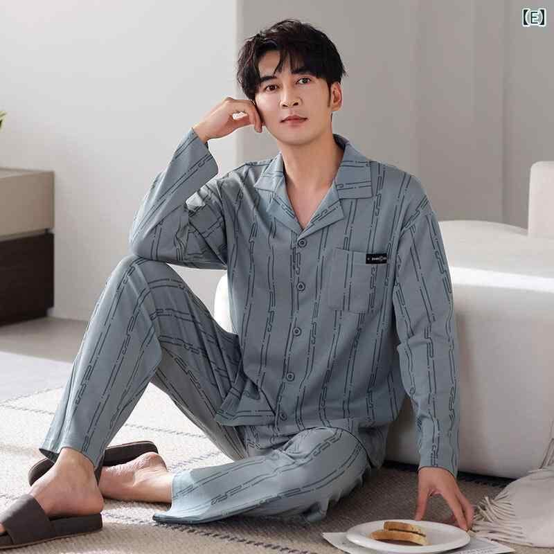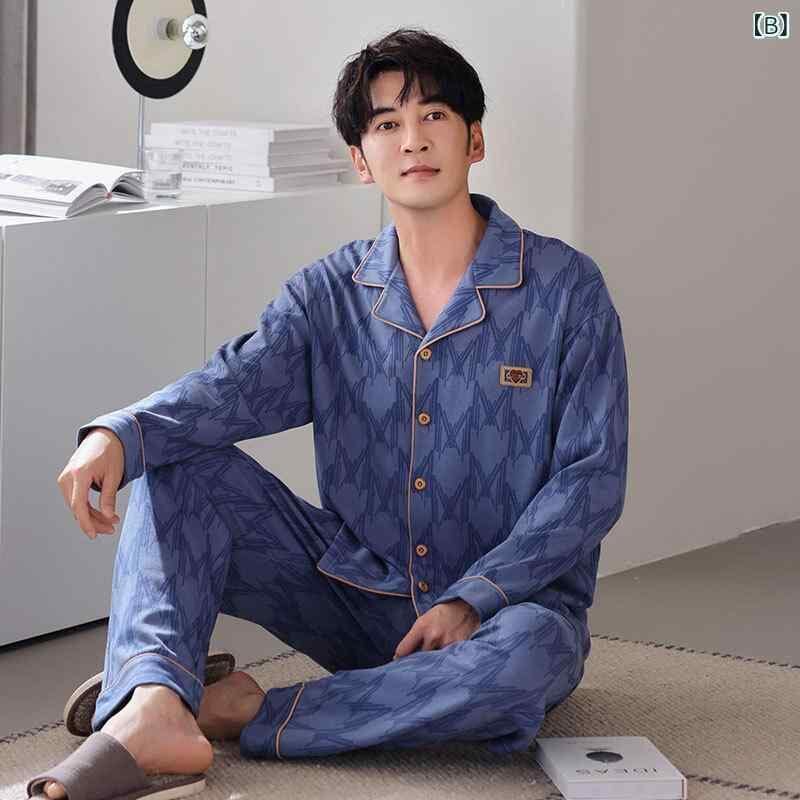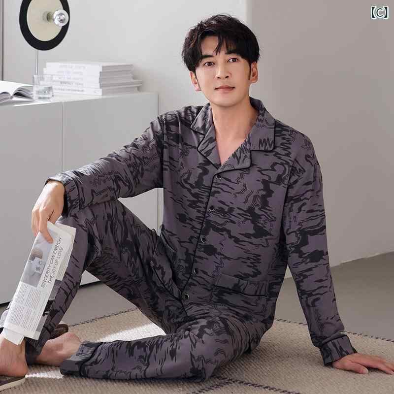 パジャマ メンズ 綿 コットン 長袖 ゆったり リラックス ビッグシルエット 大きいサイズ ルームウェア 部屋着 寝巻き カジュアル 上下セット セットアップ 春秋 通気性 伸縮性 快適 保温性 開襟シャツ 中厚手