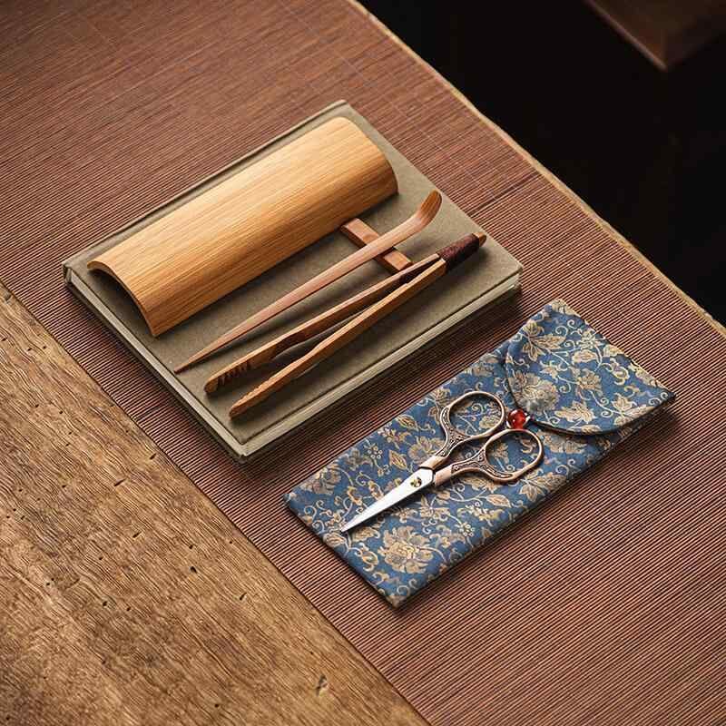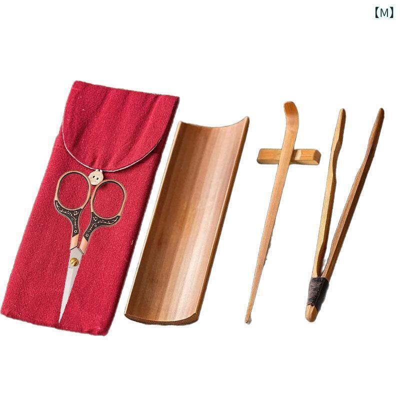 茶道道具 天然竹製 茶葉見本入れ 茶葉さじ 茶道トング 茶葉ほぐし 茶葉ハサミ 布製収納袋付き 携帯 コンパクト 旅行 茶席 お点前 中式 和モダン