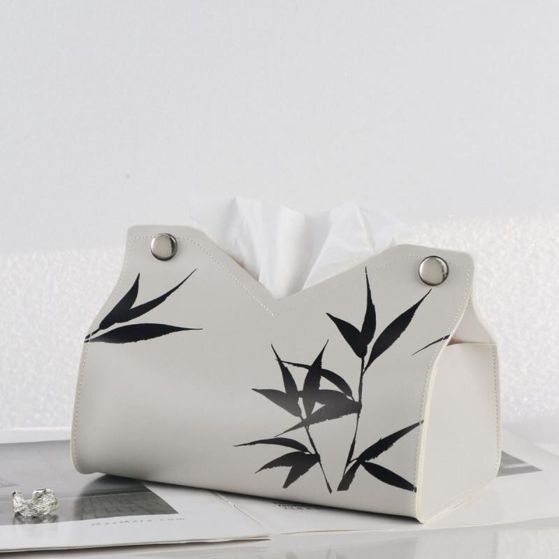 ティッシュケース リビング 卓上用 おしゃれ レザー製 墨竹デザイン 東洋美学 高級感 中国風 和モダン インテリア 多機能 防水仕様