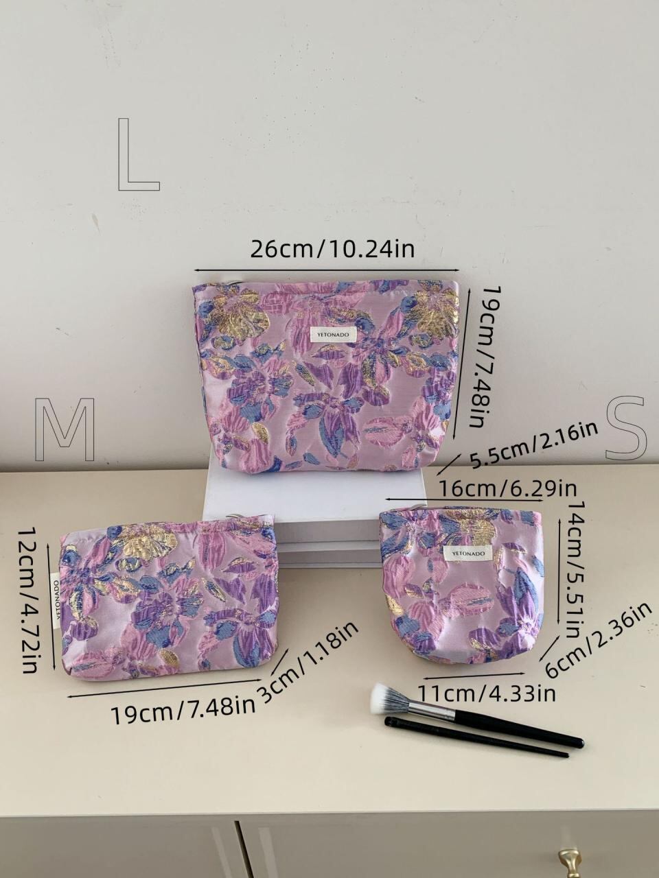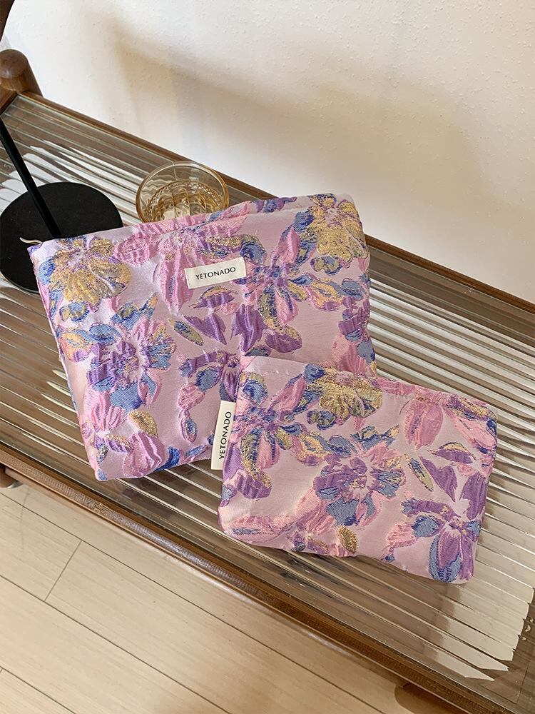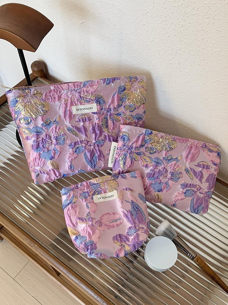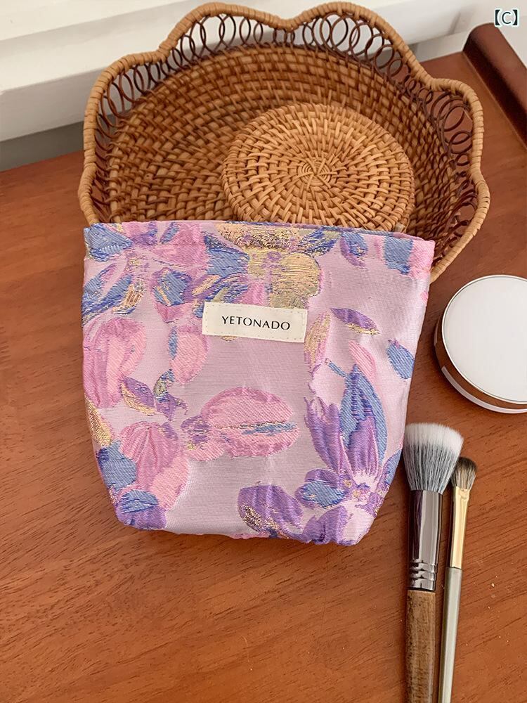 化粧ポーチ レディース 大容量 携帯用 お出かけ用 収納 コスメポーチ インナーバッグ クラッチバッグ パープル エンボス花柄 かわいい ポリエステル