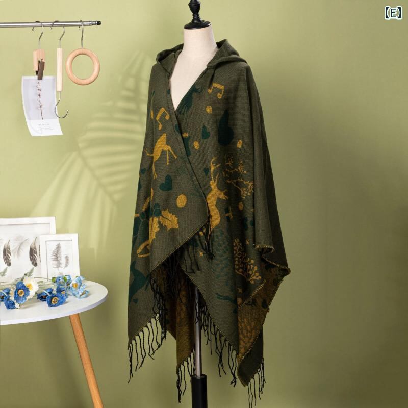 ポンチョ レディース フード付き フリンジ 鹿柄 音符柄 ショール ケープ カーディガン 羽織り 上品 高級感 トラベル 着回し ポリエステル アクリル
