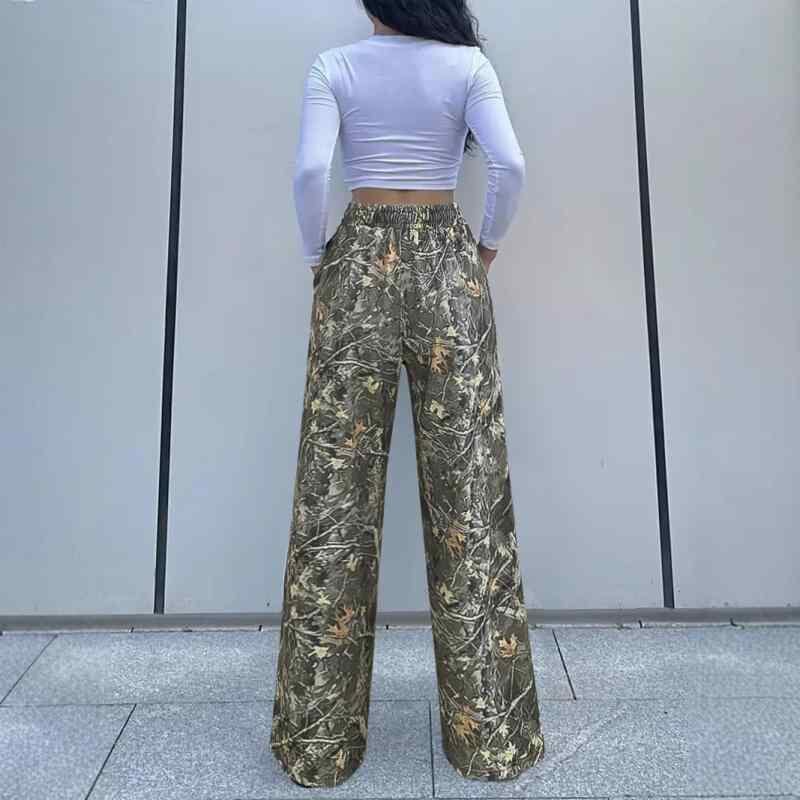 パンツ レディース 春夏 カジュアル リラックススタイル ゆったり ワイド ドロストウエストゴム 迷彩柄 カモフラージュプリント ロング丈 グリーン ポリエステル スパンデックス