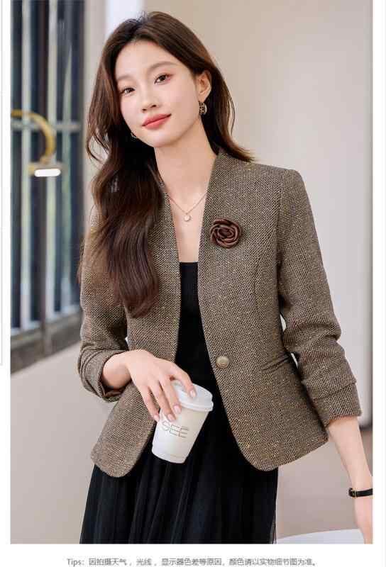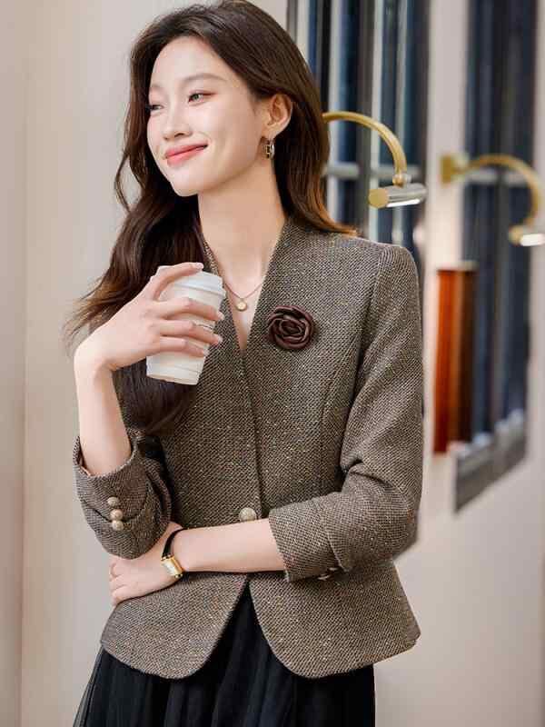 ジャケット レディース ショート丈 春秋 ポリエステル ビジネス オフィス 通勤 オフィスカジュアル エレガント 上品 きれいめ 高級感 低身長 小柄向け コーヒーブラウン