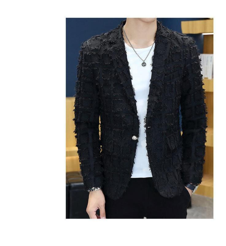 ジャケット メンズ 男性用 韓国風 ニット 切り替え フリンジ チェック柄 カジュアル スリム 細身 テーラードカラー シングルブレスト 1つボタン ポリエステル混紡 おしゃれ 普段使い