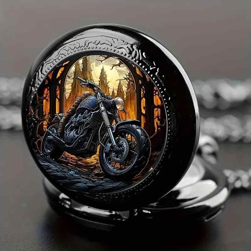 懐中時計 ユニセックス 男女兼用 キッズ 子供用 レトロ ヴィンテージ クラシック オートバイ バイク 黒 ブラック クォーツ式 ワールドタイム 世界時間機能 ネックレスペンダント 吊り下げ 飾り ファッション