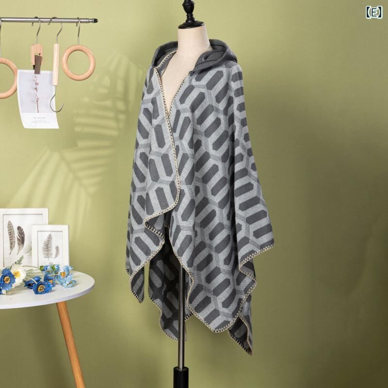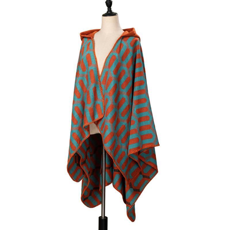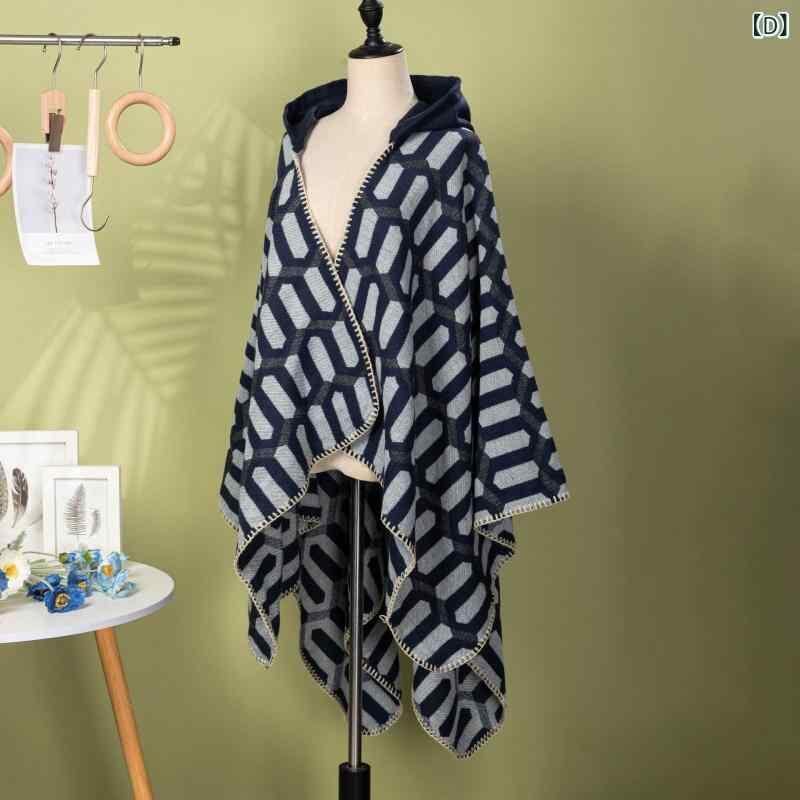 ポンチョ レディース フード付き 幾何学模様 ブロック柄 レトロ クラシック 防寒 防風 暖かい 着回し ケープ ショール 旅行 アウトドア 普段使い ポリエステル アクリル