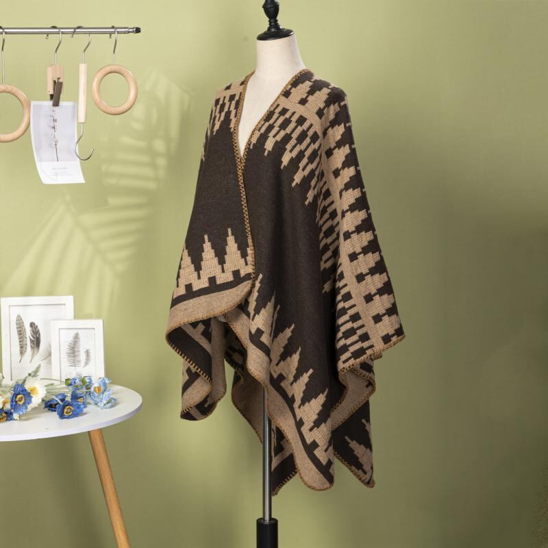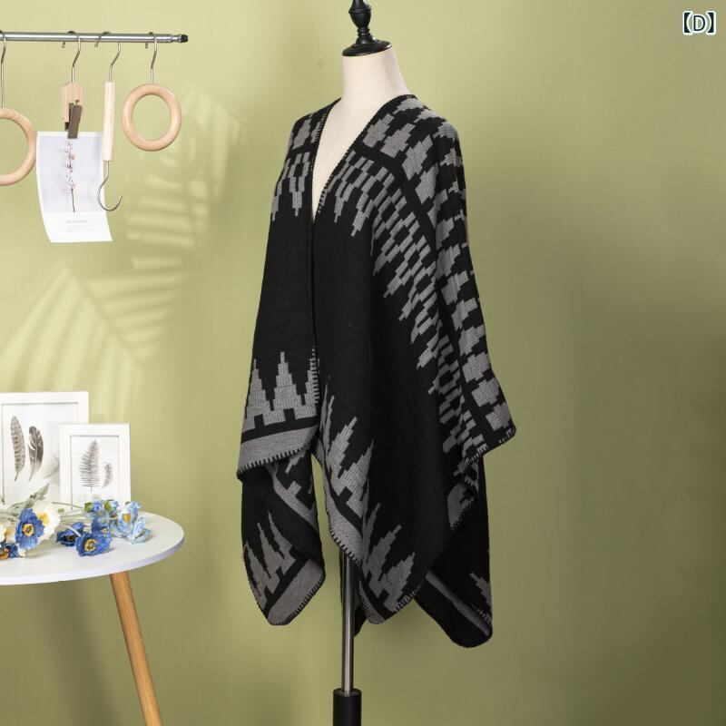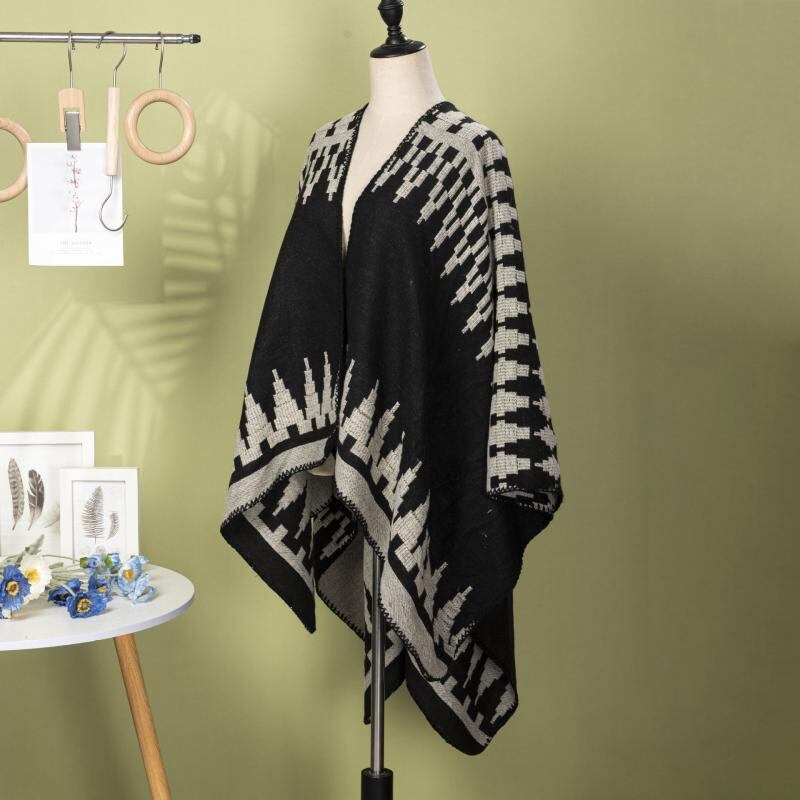 ポンチョ 男女兼用 ストリート 個性的 幾何学模様 おしゃれ 保温 冷房対策 羽織り ケープ マント アウター アウトドア 旅行 ポリエステル アクリル ブラック ネイビー カーキ ブラックグレー ブルー系