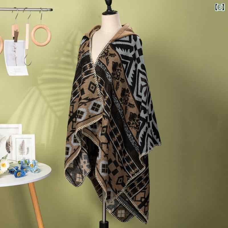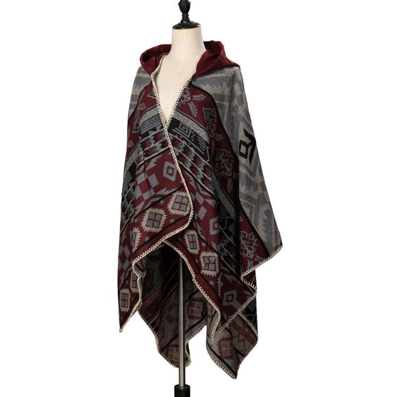 ポンチョ ユニセックス 男女兼用 ボヘミアン風 幾何学 花柄 縁かがり フード付き ケープ マント 防風 保温 防寒 旅行 リゾート 普段使い ポリエステル アクリル ブラック ワインレッド