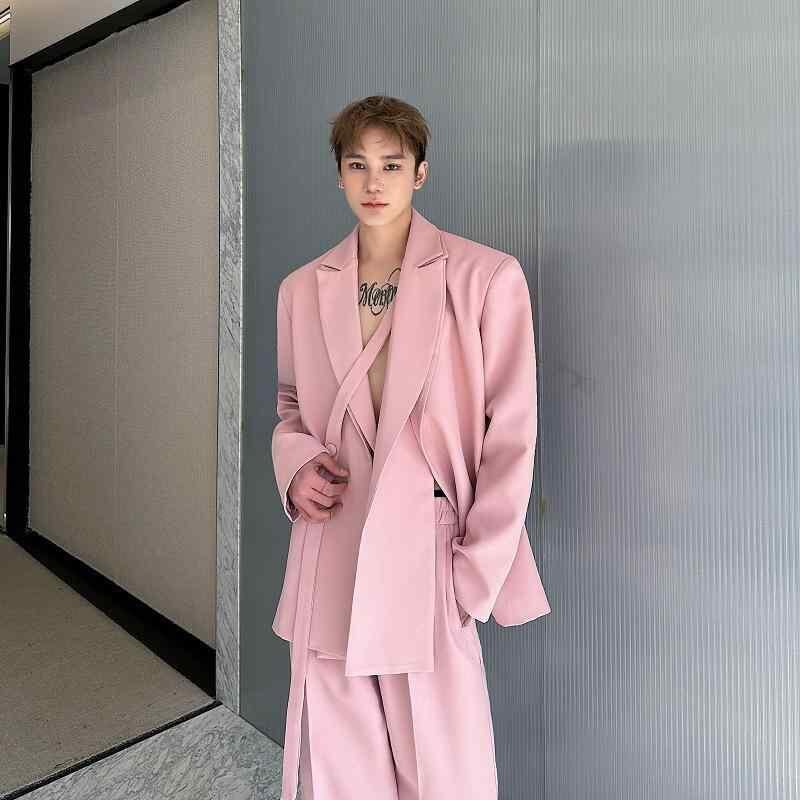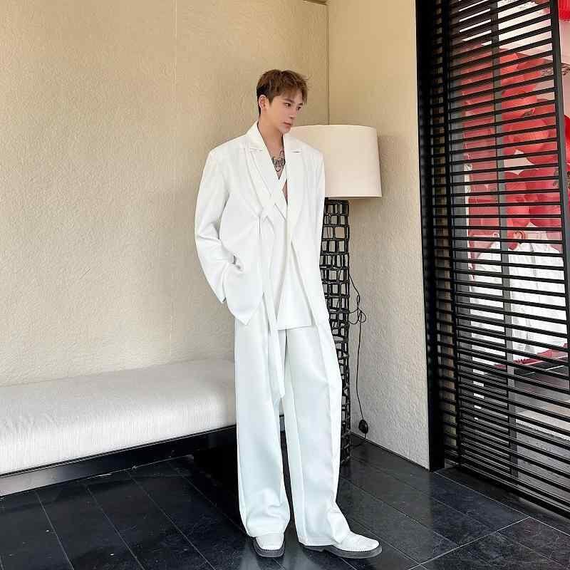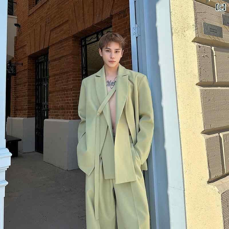 スーツ セットアップ メンズ 男性用 2点セット ダブルカラー 紐ベルト デザイン ジャケット ワイド ストレート カジュアル ロングパンツ ゆったり ビッグシルエット 通気性 洗える 耐久性 ポリエステル 綿混