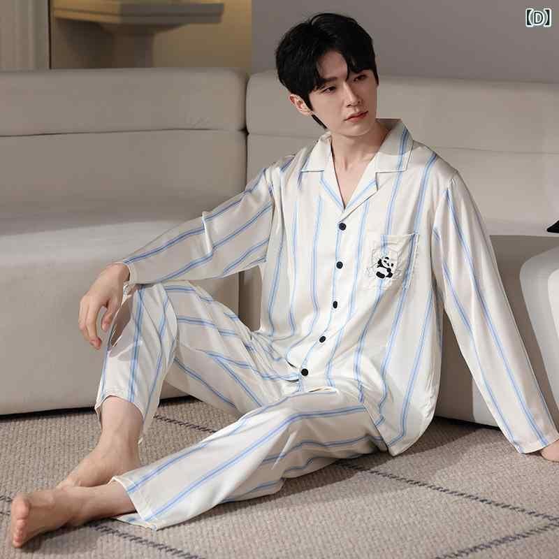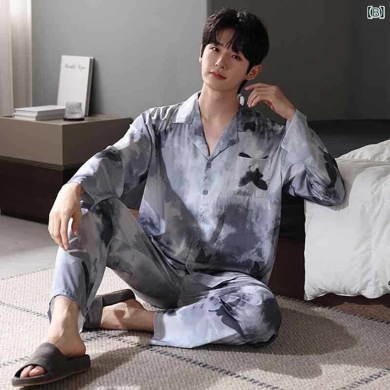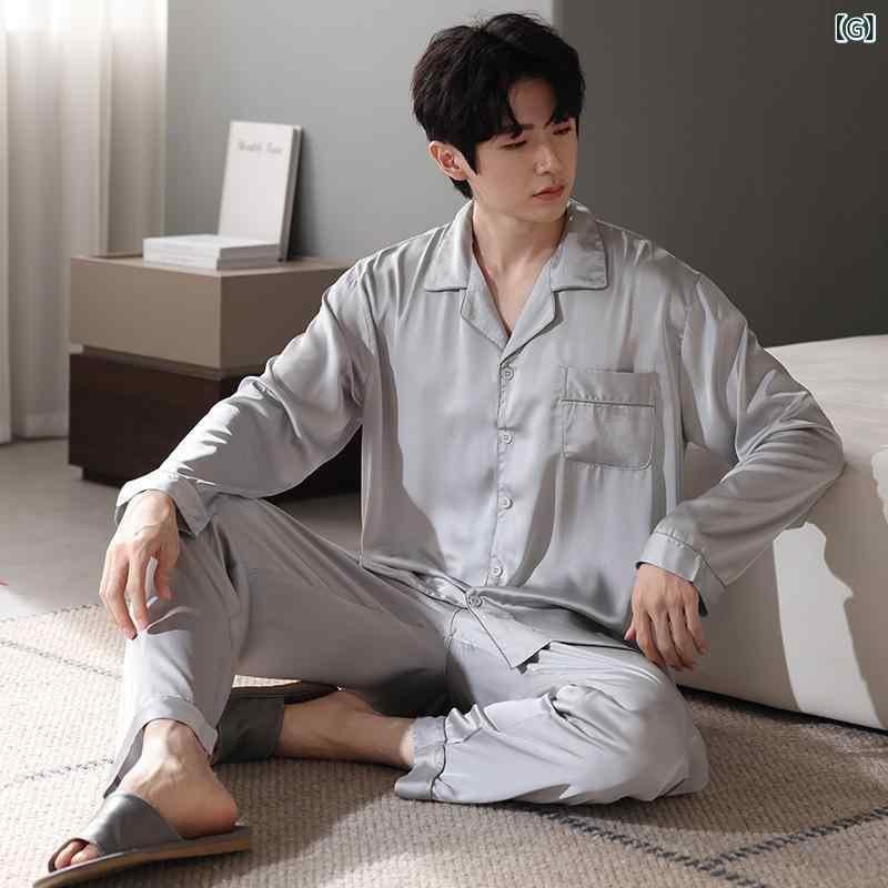 パジャマ 男性用 開襟シャツ ポリエステル 接触冷感 長袖 薄手 サテン風 シルク調 リラックス 快適 通気性 オールシーズン 高級感 ルームウェア ホームウェア 外出着 セットアップ 上下セット