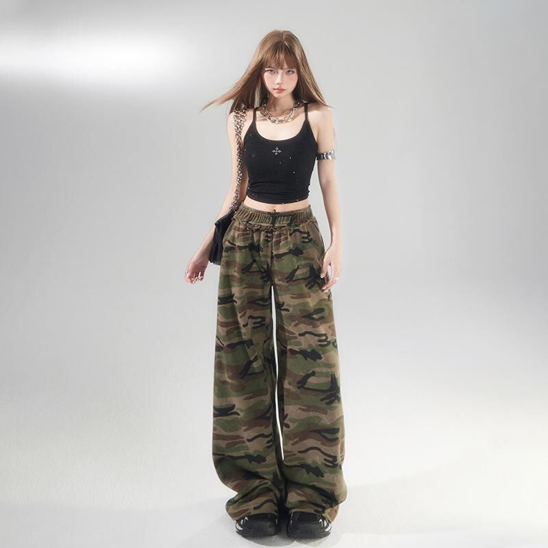パンツ レディース ストリート アメカジ 迷彩柄 デニム ワイドパンツ ハイウエスト ルーズ ゆったり ストレート 落ち感 ドレープ感 フルレングス カジュアル スポーツ 春夏