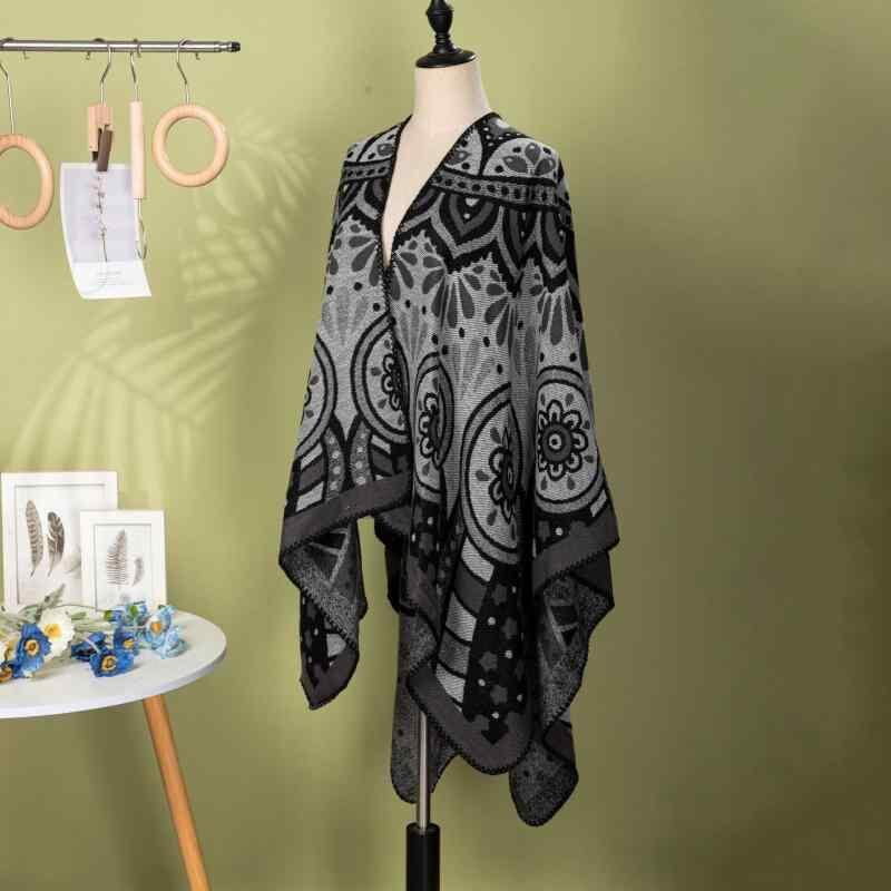 ストール レディース 大判 ポンチョ ケープ 民族風 花柄 幾何学模様 旅行 トラベル 街歩き 保温 防寒 オールシーズン ポリエステル アクリル レッド グレー