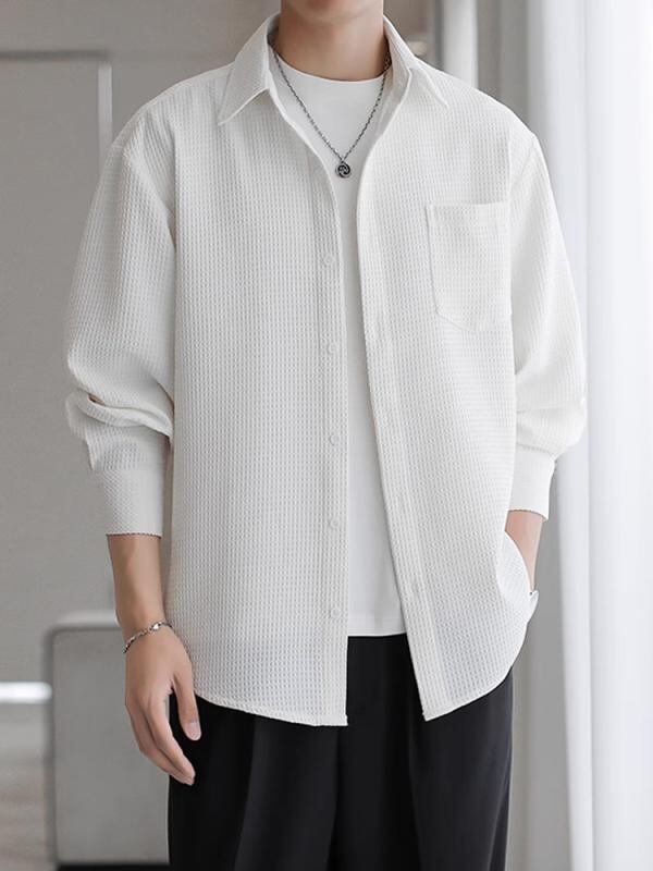 シャツジャケット メンズ 男性用 韓国風 カジュアル 高級感 ワッフル素材 襟付き 長袖 前開き ゆったり ルーズフィット ワークテイスト 切り替え 薄手 ストレッチ ウォッシャブル イージーケア ポリエステル 春秋