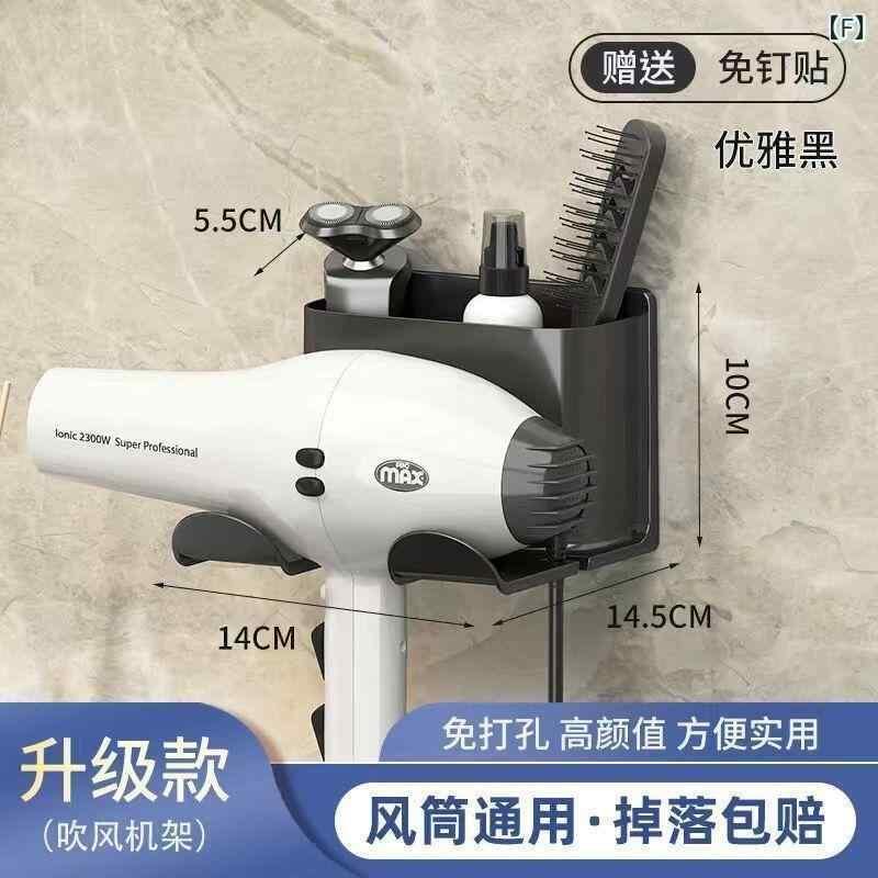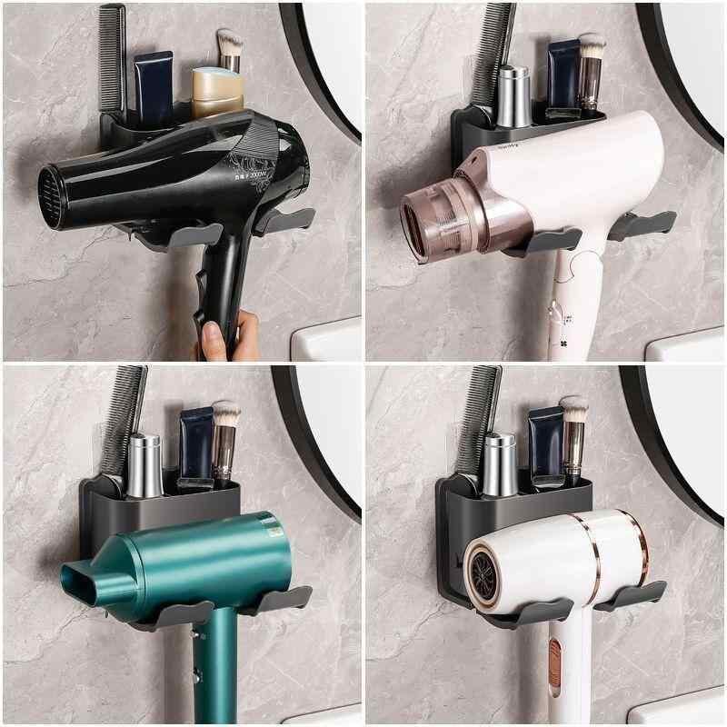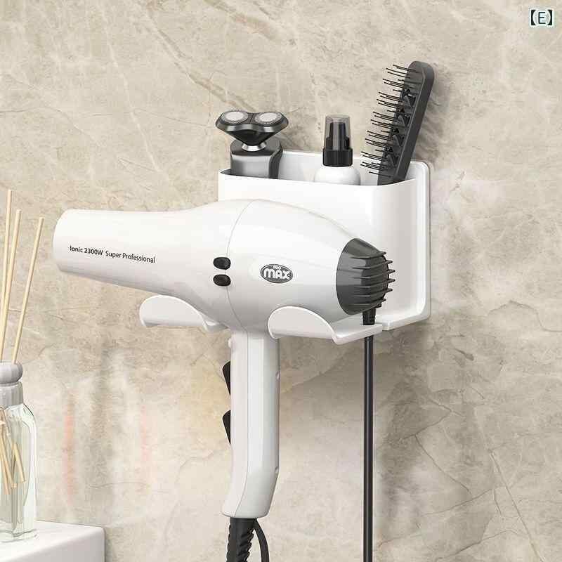 ドライヤーホルダー バスルーム 洗面所 壁掛け 穴あけ不要 粘着式 ヘアドライヤースタンド 収納ラック ウォールマウント 省スペース プラスチック製 小物入れ付き 耐久性