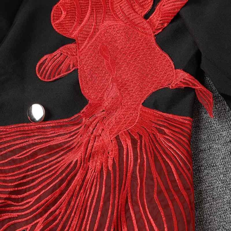 テーラードジャケット レディース 欧米風 刺繡 金魚モチーフ 切り替え アシンメトリー チュール オーバーサイズ ルーズフィット ミドル丈 長袖 ダブルボタン ポリエステル ブラック 春夏 個性派 ストリート カジュアル