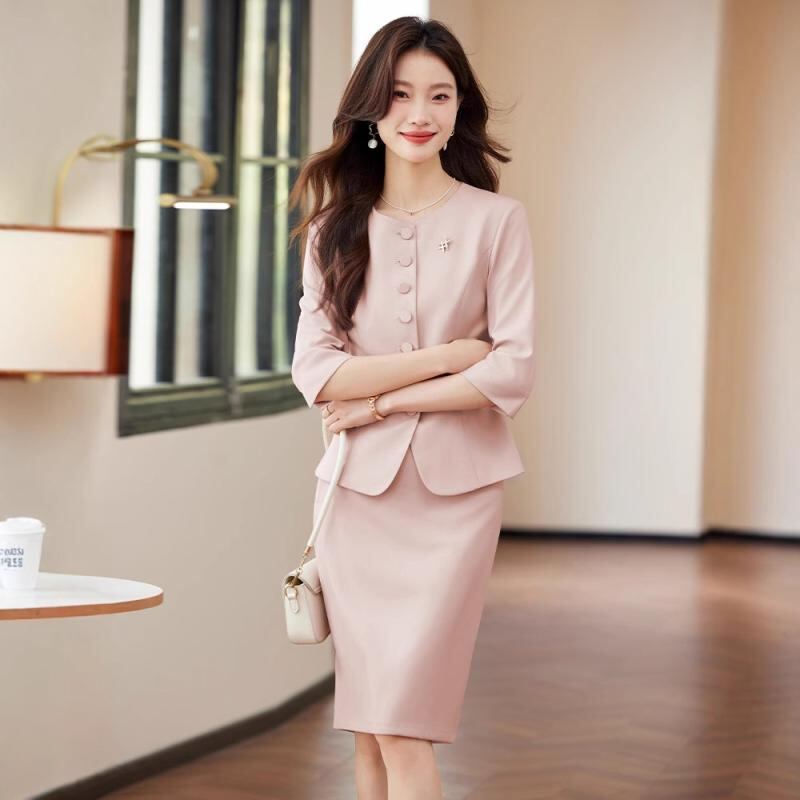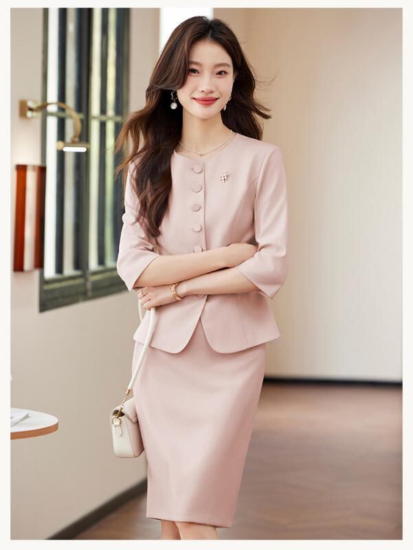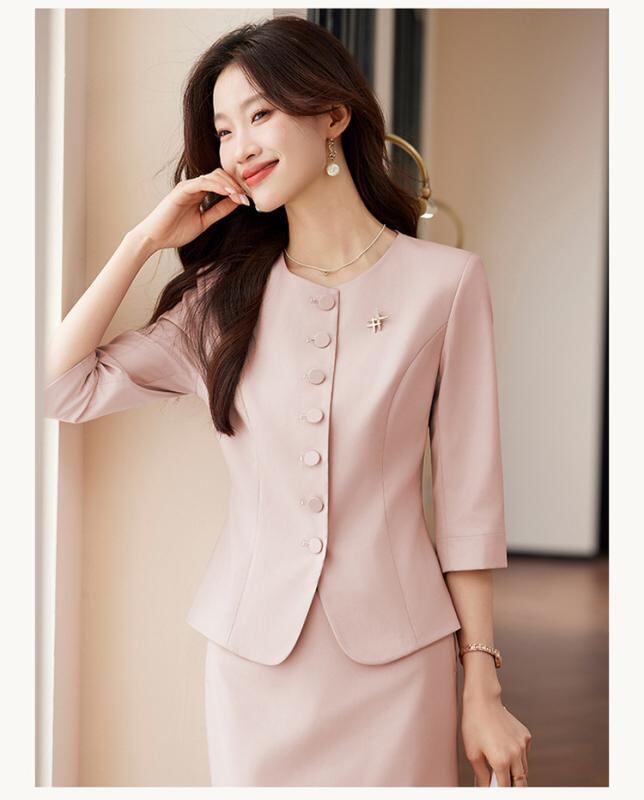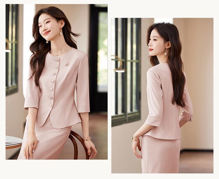 ["・柄: 無地","・フィット: スリムフィット","・丈: レギュラー丈","・ネックライン: テーラードカラー","・袖丈: 七分袖","・袖タイプ: レギュラー","・デザイン要素: ポケット","・加工: アイロン不要","・主な素材: ポリエステル90-95%","・カラー展開: ダークブルー、ピンク、アプリコット","・サイズ展開: S, M, L, XL, XXL, XXXL, XXXXL","・スタイル: エレガント、通勤","・前立て: シングルブレスト","・性別: レディース","・カテゴリ: ジャケット"]