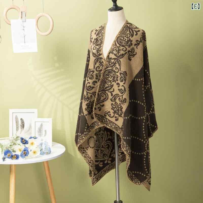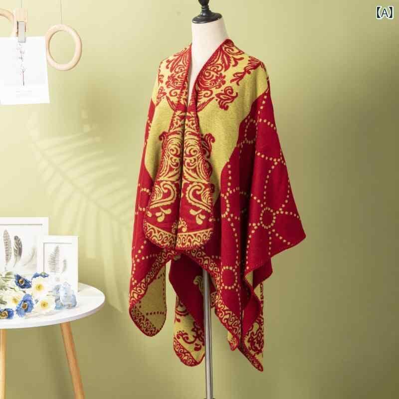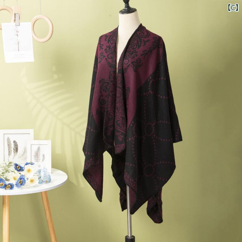 ショール レディース ポンチョ ケープ レトロ 民族調 トーテム柄 水玉 線柄 厚手 防寒 暖か ポリエステル アクリル 旅行 お出かけ